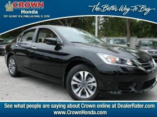 , Before Discount:$23,545.00, Dealer Discount:($3,125.00), Internet Price:$20,420.00, Total Savings:($3,125.00)!BACK-UP CAMERA, BLUETOOTH, MP3 Player, KEYLESS ENTRY, 36 MPG, The Accord is synonymous with Honda and has been known for nearly four decades as a reliable, comfortable, pragmatic way to move families. What began as a 2-door hatchback in 1976 has grown into today's full-size sedan and coupe. Like the rest of the car, the 2014 Accord's 5-passenger interior is a pleasing step forward. The cabin boasts soft-touch materials for a quality feel. The front seats are comfortable, and the driver's seat actually toned down the lumbar support. The rear seats have even more room, as does the trunk. Sleek, rippled sheet metal defines a more streamlined exterior that has shrunk around an interior that feels roomier than previous generations. The most surprising thing about the Accord is its refined continuously variable transmission (CVT). Mated to the 4-cylinder, this CVT feels much like a normal automatic, mimicking gear changes. Even a base Accord has good power for acceleration and passing, yet attains an impressive mileage on the highway. Move up to a V6 model with 6-speed automatic transmission, and the Accord is downright quick. For the individual looking to consume less the 2014 Accord comes in a Hybrid version as well. This operates on a 141-hp 2.0-liter, 16-valve i-VTEC 4-cylinder engine and a 55-hp lithium-ion battery pack for a net hp of 196. The Hybrid can achieve ratings of 50 cty and 46 hwy. To help maximize efficiency on the road, the Accord Hybrid seamlessly shifts between three distinct drive modes: EV Drive, Hybrid Drive and Engine Drive. EV Drive is 100% electric, and generally is used during braking and when starting from a stop. Hybrid Drive uses the fuel engine and electric motor to provide extra zip during acceleration, and once your Accord Hybrid is cruising with highway efficiency, Engine Drive takes over. If you want a hassle-free, pleasing family car with a reputation for quality and an immediate familiarity, you can't go wrong with the Accord. Crown Automotive Group serving Tampa Bay Florida offers great low prices, rebates and incentives for new Group & used Group cars, vans and SUVs to all of our neighbors in St. Petersburg, Largo, Clearwater, and Pinellas Park. Our Expert Service & Parts staff assist our Florida customers keep their Group vehicles in great shape.