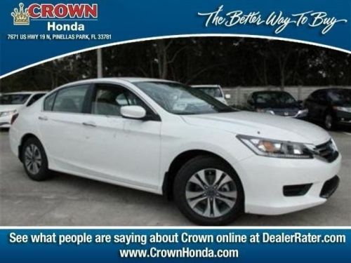 , Before Discount:$23,545.00, Dealer Discount:($3,125.00), Internet Price:$20,420.00, Total Savings:($3,125.00)!BACK-UP CAMERA, BLUETOOTH, MP3 Player, KEYLESS ENTRY, 36 MPG, The Accord is synonymous with Honda and has been known for nearly four decades as a reliable, comfortable, pragmatic way to move families. What began as a 2-door hatchback in 1976 has grown into today's full-size sedan and coupe. Like the rest of the car, the 2014 Accord's 5-passenger interior is a pleasing step forward. The cabin boasts soft-touch materials for a quality feel. The front seats are comfortable, and the driver's seat actually toned down the lumbar support. The rear seats have even more room, as does the trunk. Sleek, rippled sheet metal defines a more streamlined exterior that has shrunk around an interior that feels roomier than previous generations. The most surprising thing about the Accord is its refined continuously variable transmission (CVT). Mated to the 4-cylinder, this CVT feels much like a normal automatic, mimicking gear changes. Even a base Accord has good power for acceleration and passing, yet attains an impressive mileage on the highway. Move up to a V6 model with 6-speed automatic transmission, and the Accord is downright quick. For the individual looking to consume less the 2014 Accord comes in a Hybrid version as well. This operates on a 141-hp 2.0-liter, 16-valve i-VTEC 4-cylinder engine and a 55-hp lithium-ion battery pack for a net hp of 196. The Hybrid can achieve ratings of 50 cty and 46 hwy. To help maximize efficiency on the road, the Accord Hybrid seamlessly shifts between three distinct drive modes: EV Drive, Hybrid Drive and Engine Drive. EV Drive is 100% electric, and generally is used during braking and when starting from a stop. Hybrid Drive uses the fuel engine and electric motor to provide extra zip during acceleration, and once your Accord Hybrid is cruising with highway efficiency, Engine Drive takes over. If you want a hassle-free, pleasing family car with a reputation for quality and an immediate familiarity, you can't go wrong with the Accord. Crown Automotive Group serving Tampa Bay Florida offers great low prices, rebates and incentives for new Group & used Group cars, vans and SUVs to all of our neighbors in St. Petersburg, Largo, Clearwater, and Pinellas Park. Our Expert Service & Parts staff assist our Florida customers keep their Group vehicles in great shape.