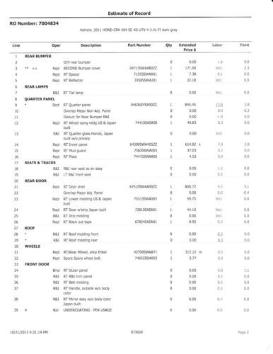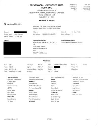 Our car was in an accident- a pickup truck hit it in the rear right section (right at the wheel). However, the engine wasn't damaged at all. I got a repair estimate from Mike's Auto Body, which was around $12,000, but we don't want to drive the car any more. It will be a good deal for those who sell Honda parts. The car is currently stored at a tow-truck yard and can be viewed by appointment in Brentwood, CA. The car used to be a lease, but is now fully paid off, and as you can see in the last photo, I have a clear title in my possession. Please, ask all questions via the Ebay message system BEFORE your purchase. I won't make any calls, until I know you're a serious buyer. |