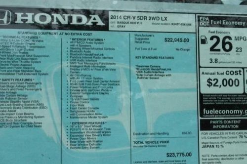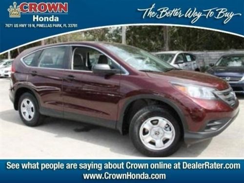 , Before Discount:$23,775.00, Dealer Discount:($2,391.00), Internet Price:$21,384.00, Total Savings:($2,391.00)!BACK-UP CAMERA, BLUETOOTH, MP3 Player, KEYLESS ENTRY, 31 MPG, The 2014 Honda CR-V has a modern aerodynamic look, with sweeping lines, exciting body sculpting, and a dramatic profile. It has enough attitude and ability to get you around town and then tackle the open road and the great outdoors. The CR-V comes equipped with a 2.4-Liter i-VTEC 4-Cylinder engine with 185 Horsepower and a 5-Speed Automatic Transmission. It has a rigid unit-body structure, coupled with taut suspension tuning, which give it impressive handling characteristics. For ultimate 4-season security, the 2014 CR-V is available with Honda's Real Time All-Wheel Drive with Intelligent Control System that smoothes out initial acceleration and can transfer up to 100 percent of torque to the rear wheels if necessary. The CR-V is very fuel-efficient and can get up to an EPA estimated 31 MPG Highway when in two-wheel drive. Hit the green ECON button, and the vehicle makes adjustments to its systems so they can be more efficient. Then you get feedback as you drive from Eco Assist to let you know how efficient your driving is. Honda has placed bars around the speedometer, and the longer you keep them in the green, the farther you can go on a tank of gas. The 5-passenger CR-V remains modestly sized on the outside, but is extremely roomy inside, with a rear seat that accommodates adults and a proper-sized cargo area. Special attention is paid to driver comfort, with supportive front seats that flank an accommodating center console punctuated by two big cup holders. A large covered center stow bin houses USB and auxiliary inputs as well as a 12-volt power point. Finally, its large single-piece liftgate, coupled with a significantly lower lift-over height, eases loading and unloading chores. Check out the 2014 Honda CR-V Today! Crown Automotive Group serving Tampa Bay Florida offers great low prices, rebates and incentives for new Group & used Group cars, vans and SUVs to all of our neighbors in St. Petersburg, Largo, Clearwater, and Pinellas Park. Our Expert Service & Parts staff assist our Florida customers keep their Group vehicles in great shape.