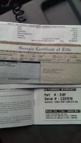 4 door Automatic Transmission 4cylinder VTEC CURRENT EMISSIONS 172000 MILES Very Well Maintained: New Spark plugs, New Wires, New Distributor, New Timing Belt, New water pump, New alternator, New Power steering pump, Rebuilt calipers, New rotors, New break pads, New o2 sensor, New Serpentine belt, New tires, REFURBISHED MOTOR FROM NAPA WITH A 3 YEAR unlimited Miles NATIONWIDE WARRANTY,WITH ALL DOCUMENTS AND RECEIPTS TO GO ALONG WITH IT. REBUILT TRANSMISSION BY MR TRANSMISSION 3 YEARS AGO. All fluids changed on time, every time. AC BLOWS ICE COLD Dose not leak, dose not smoke, dose not over heat. Power Windows, power door locks, power mirrors,, tilt wheel, cruise control, Factory tinted windows. Clear GA Title in hand, Emissions pass paper in hand, One owner since New. Just recently detailed. interior: is in GREAT! Condition, No a Single Blemish on the Interior, all original. Exterior: is in excellent condition, NO DENTS OR DINGS, All original. 6787.o.nine?five.five7five Call or text only, anytime. If no answer please leave text message,or call again, please no voice Mails. PLEASE NO SCAMS CASH ONLY, NO PAY PAL, NO SHIPPING TO CHINA, THIS IS A REAL CAR, SO I DON'T NEED ANY FAKE PEOPLE CALLING, Thank you. |