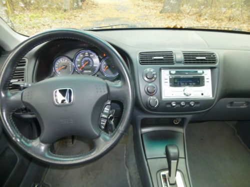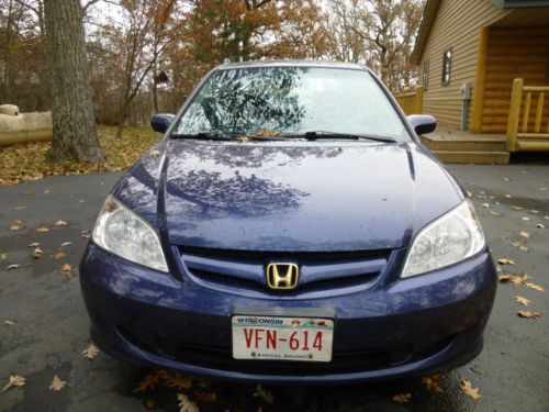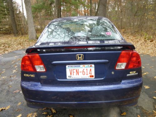 Grandma is selling her 2005 Honda Civic because she bought a new 2013. We are both retired and are willing to assist you in delivery of this car. If you need additional information or more pictures, you may contact us at 715.824.5876. 2005 Honda Civic 4 door EX SE (Special Edition) with Gold Trim Package Single owner, purchased with 8 miles on 12/24/2004. This vehicle is in very good to excellent condition. The car was parked in a garage in WISCONSIN and had smoke-free drivers. Vehicle was driven to and from work for first 4 years and then used for pleasure to present. This vehicle averaged 35 MPG for all miles driven. Oil and filter was changed every 3K miles. Accident free except for a new windshield. Replaced all 4 tires on April 4, 2011 at 60,600 miles (195/60R15) This vehicle is loaded: 127 HP 1.7L SOHC 16 valve V-tec 4-cylinder engine 4 Speed Transmission Driver's and Front Passenger Dual-Stage Airbags Anti-Lock Braking System Immobilizer Theft-Deterrent System Latch System for Child Safety Seat Air Conditioning Power Windows and Door Locks Cruise Control Power Moon Roof with Tilt Feature Power Door Mirrors Rear Window Defroster AM-FM 6-disc in-dash Audio System with 6 speakers and MP3 playback. Anti-theft radio Security Code. Leather Wrapped Steering Wheel 15 inch x 6 inch 15 spoke Alloy Wheels Back Seat Folds Down for Hauling Rear Wing Spoiler