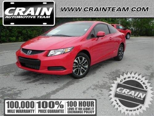 This outstanding example of a 2013 Honda Civic Cpe EX COUPE is offered by Crain Hyundai of Bentonville. 888-292-2234 This vehicle was engineered to be both economically and environmentally friendly with exceptional fuel efficiency. The interior of this Civic Cpe EX COUPE has been through meticulous inspection and could almost pass for a brand new vehicle. In addition to unbelievable options, this vehicle comes equipped with a factory warranty. More information about the 2013 Honda Civic Cpe: For decades, the Civic has offered one of the best compact-car picks for those who want to keep their ownership costs low and plan to keep their cars a long time. The Civic is also one of the roomiest small sedans, with even better ride comfort and interior refinement this year. Top models can still be appointed with the works--including a navigation system and full leather upholstery--making the Civic feel more like a compact luxury sedan than an affordable commuter. Strengths of this model include responsive driving feel, improved standard features, Sedan or coupe body styles, roomy interior, and range of drivetrains Every new and pre-owned vehicle is backed by the Crain Commitment, including our 100% low price guarantee, a 100 hour love it or leave it exchange policy, and a 100 year 100,000 mile warranty. The Crain Team's Got 'Em! Give us a call at Crain Hyundai of Bentonville 888-292-2234. Combined Crain Hyundai's sales department has over 100 years of experience and dedication in taking care of our customers before and after the sale. We'll do our best to get you into the vehicle you have always wanted, and we strive to make buying or leasing a new vehicle a pleasant and rewarding experience.... That new Hyundai is waiting for you!