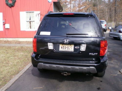 I am selling my 2003 Honda Pilot EX-L AWD SUV. I am the original owner and have given this vehicle TLC over the 10.5 years I've owned it. The engine is strong and all systems work. Oil and filter changes have been made every 4,000 miles. Major maintenance items such as replacement of the Timing Belt, Water Pump, Spark Plugs, New Brakes, Cooling System and Transmission Flushes have all been done by Burns Honda in Marlton, NJ (I have the receipts). New GoodYear Integrity tires were installed in July 2013 along with a Front End Alignment. This vehicle has never been in an accident. The interior shows normal wear with no rips, tears, or stains to the leather seats. The body has a few minor scratches and dings. There is a small dent (pictured) on the driver's side rear quarter panel just before the left tail light. That is the only imperfection in this vehicle. Alloy wheels are in great shape. I just had the oil changed and tires rotated in February 2014. There is also an aftermarket towing/hitch package installed by Franklin Trailers of West Berlin, NJ. I'll be glad to answer an question via my mobile phone 856-220-2182. |
