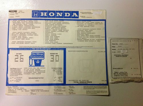 This really is a see to believe car and can say that there is absolutely nothing mechanically wrong. Listed small flaws in the paint above - but will say this is pretty close to mint for the original paint. Garaged most of the time - rubber trim is really like new - removable top does not leak whatsoever. No wrinkling at the door panels. Pretty mint original floor mats (I think they call them rainbows lol). I will include the original Monroe window sticker to prove the origin as rust-free California. I believe the buy it now price, though above KBB is perfectly reasonable for this rare top model DOHN VTEC Del Sol - It represents Honda at its finest and is a wonderful car for the price