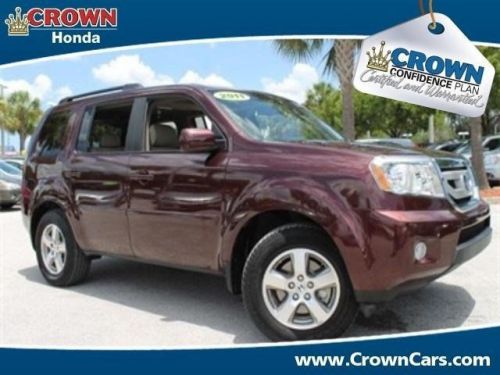 **CROWN CONFIDENCE PLAN USED CAR GUARANTEE Certified. Superb visibility to see and be seen. Clear visibility gives the go-ahead. CROWN CONFIDENCE PLAN CERTIFIED GUARANTEE includes our exclusive 101 point safety inspection, Carfax vehicle history report, 100,000 mile powertrain warranty for as long as you own your car, and our exclusive peace of mind 7 day or 500 mile exchange policy. Our "no hassle, no games" pricing policy means that you receive the lowest internet "live market price" on every vehicle, every day, only at Crown Honda. Who could say no to a simply great SUV like this outstanding-looking 2011 Honda Pilot? New Car Test Drive said, "...plenty of cargo and people versatility in an efficient package, with towing capacity for light loads and the available confidence of all-wheel drive..." Consumer Guide Midsize SUV Best Buy. It is nicely equipped with features such as **CROWN CONFIDENCE PLAN USED CAR GUARANTEE Certified, 3rd row seats: split-bench, 4.312 Axle Ratio, 4-Wheel Disc Brakes, 7 Speakers, ABS brakes, Air Conditioning, AM/FM radio, AM/FM/6-Disc In-Dash Audio System, Anti-whiplash front head restraints, Auto-dimming Rear-View mirror, Automatic temperature control, Bodyside moldings, Brake assist, Bumpers: body-color, CD player, Delay-off headlights, Driver door bin, Driver vanity mirror, Dual front impact airbags, Dual front side impact airbags, Electronic Stability Control, Four wheel independent suspension, Front anti-roll bar, Front Bucket Seats, Front Center Armrest, Front dual zone A/C, Front fog lights, Front reading lights, Fully automatic headlights, Garage door transmitter: HomeLink, Heated Front Bucket Seats, Heated front seats, Illuminated entry, Leather Shift Knob, Leather-Trimmed Seat Trim, Low tire pressure warning, MP3 decoder, Occupant sensing airbag, Outside temperature display, Overhead airbag, Overhead console, Panic alarm, Passenger door bin, Passenger vanity mirror, Power door mirrors, Power driver seat, Power moonroof, Power passenger seat, Power steering, Power windows, Radio data system, Rear air conditioning, Rear anti-roll bar, Rear reading lights, Rear seat center armrest, Rear window defroster, Rear window wiper, Remote keyless entry, Roof rack: rails only, Security system, Speed control, Speed-sensing steering, Speed-Sensitive Wipers, Split folding rear seat, Steering wheel mounted audio controls, Tachometer, Telescoping steering wheel, Tilt steering wheel, Traction control, Trip computer, Variably intermittent wipers, and XM Radio. The low-mile freshness of this wonderful Pilot will make it a favorite among our more educated buyers. All prices plus sales tax, tag and titling, and dealer service fee of $697.00, which represents cost and profits to the selling dealer for items such as cleaning, inspecting, adjusting new vehicles and preparing documents related to the sale. A Better Way To Buy. What's the difference between a used vehicle from some other dealer and a pre-owned vehicle from Crown Automotive? It's simple; one of them is a better value because one comes backed by the Crown Used Car Confidence Plan! You'll get a CarFax report, guaranteed clean title, Powertrain warranty for as long as you own your vehicle (or 100,00 miles), and a 7 day/500 mile no hassle exchange policy!