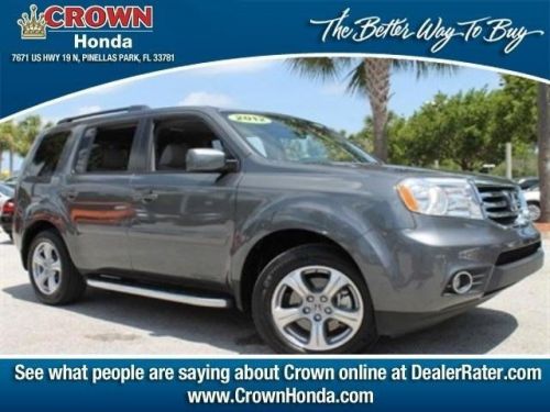 Honda Certified and LEATHER,SUNROOF,RUNNING BOARDS. Catch a glimpse of everything with expansive visibility. Superb visibility to see and be seen. How enticing is the fuel economy of this stunning-looking 2013 Honda Pilot? Honda Certified Pre-Owned means you not only get the reassurance of a 12mo/12,000 mile limited warranty, but also up to a 7yr/100k mile powertrain warranty, a 150-point inspection/reconditioning, and a complete CARFAX vehicle history report. Great gas mileage with plenty of room! How do they do that?! This Pilot is nicely equipped with features such as Honda Certified, LEATHER,SUNROOF,RUNNING BOARDS, 3rd row seats: split-bench, 4.312 Axle Ratio, 4-Wheel Disc Brakes, 7 Speakers, ABS brakes, Air Conditioning, AM/FM/CD Audio System, Anti-whiplash front head restraints, Auto-dimming Rear-View mirror, Automatic temperature control, Bodyside moldings, Brake assist, Bumpers: body-color, CD player, Delay-off headlights, Driver door bin, Driver vanity mirror, Dual front impact airbags, Dual front side impact airbags, Electronic Stability Control, Four wheel independent suspension, Front anti-roll bar, Front Bucket Seats, Front Center Armrest, Front dual zone A/C, Front fog lights, Front reading lights, Fully automatic headlights, Garage door transmitter: HomeLink, Heated Front Bucket Seats, Heated front seats, Illuminated entry, Leather Shift Knob, Leather-Trimmed Seat Trim, Low tire pressure warning, MP3 decoder, Occupant sensing airbag, Outside temperature display, Overhead airbag, Overhead console, Panic alarm, Passenger door bin, Passenger vanity mirror, Power door mirrors, Power driver seat, Power moonroof, Power passenger seat, Power steering, Power windows, Radio data system, Rear air conditioning, Rear anti-roll bar, Rear reading lights, Rear seat center armrest, Rear window defroster, Rear window wiper, Remote keyless entry, Security system, Speed control, Speed-sensing steering, Speed-Sensitive Wipers, Split folding rear seat, Steering wheel mounted audio controls, Tachometer, Telescoping steering wheel, Tilt steering wheel, Traction control, Trip computer, Variably intermittent wipers, and XM Radio. All prices plus sales tax, tag and titling, and dealer service fee of $697.00, which represents cost and profits to the selling dealer for items such as cleaning, inspecting, adjusting new vehicles and preparing documents related to the sale. A Better Way To Buy. What's the difference between a used vehicle from some other dealer and a pre-owned vehicle from Crown Automotive? It's simple; one of them is a better value because one comes backed by the Crown Used Car Confidence Plan! You'll get a CarFax report, guaranteed clean title, Powertrain warranty for as long as you own your vehicle (or 100,00 miles), and a 7 day/500 mile no hassle exchange policy!
