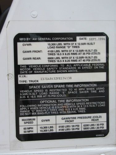 Options: Michelin 325 / 85 R16 Military Tires, 6.5L Turbo Diesel Engine 195 HP W/430 Lb Ft Torque, 2.56 Axle Ratio, Extra Set Super Swamper 38 x 15.5 x 16.5 tires, AM/FM, Cargo Area Tiedowns, CD Player/ Changer, Electrochromic Interior Rearview Mirror, Keyless Entry, Skid Plate, Tachometer, Tinted Windows, Tilt Wheel, Tow Package, Traction Control, Tan Vinyl Interior, Kenwood Speakers, Bucket Seats, Rear Bucket Seats, D Ring Brush Guard, 4-Wheel Drive, CD Player