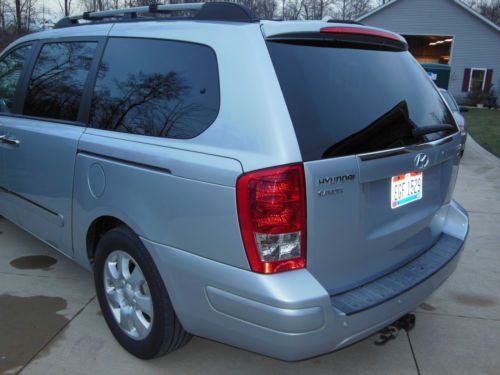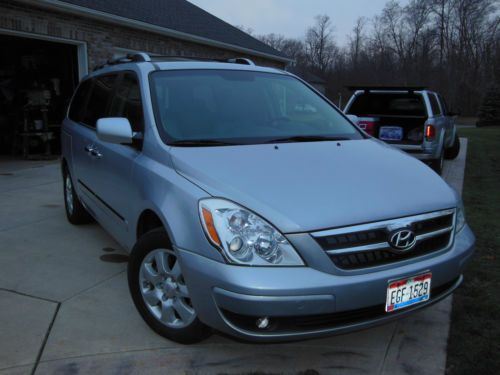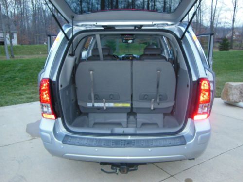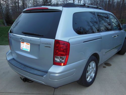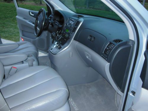I am the original owner of this beautiful Hyundai Entourage Limited van with on 39,700 miles. It still has the balance of the factory warranty. This car has never seen snow and we used it only on vacations to Florida and Tennessee to visit family and friends. I purchased it when I retired in 2007. It is fully loaded. I will attempt to list all of its accessories but I may forget a few. It is very comfortable and roomy. It seats seven. Electronic stability control, Traction control system, 4 wheel anti-lock brakes, Tire pressure monitor system, Front seat air bags, Side curtain air bags, Active front head restraints, 3.8L MPI_DOHC V6 engine, 5 speed automatic transmission with shiftronic function, 4 wheel disc brakes,17" alloy wheels, Full size spare, Dual power rear sliding doors, Power tailgate, Roof rack side rails, Dual heated sideview mirrors, Fog lights, Power front seats, Leather seating, Heated front seats, Electroluminescent gauges, Tri-zone climate control system, AM/FM/CD audio system with tilt steering wheel and audio controls, Inside Electrochromatic rearview mirror with homelink, Leather wrapped steering wheel, Premium chrome scuff plates, Power sunroof with tilt and slide, Infinity audio/CD changer/surround sound, Power adjustable foot pedals, Integrated memory system - driver's seat, mirrors and foot pedals, Backup warning sensors and carpeted floor mats. Please note that the rear seat is split in two and either or both of the seats can be stored into the floor when not in use for more storage. The second set of seats also are easily removed and they also fold down and flip up if needed. There is also a hidden hitch. We did not tow with the car but we did have a basket that fit in the hitch in case we needed more space for luggage. This was the top of the line van with every available feature when I purchased it. I love the car but we are going to buy a motorhome for our future vacations Own this Hyundai Entourage Limited w/ Ultimate Package |