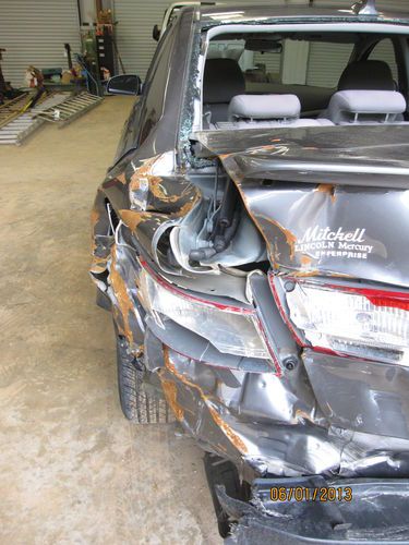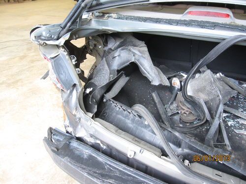 This car has been involved in an accident and will need the following parts to repair......Left rear quarter panel, left rear inner fender, rear body panel, decklid (trunk lid), left taillight rear bumper, rear window, left interior trunk panels. Couple repairable dent on right quarter panel, some scratches on the front bumper cover, about 3" crack in the windshield. I replaced the rear upper control arm, wheel, and tire so that it would be drivable. I'm sure that it will need an alignment. It should not have any other suspension damage. The left rear frame rail does not appear to be bent.