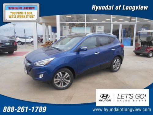 2014 Hyundai TUCSON Hyundai of Longview presents this 2014 Hyundai TUCSON FWD 4dr Limited. Represented in LAGUNA_BLUE and complimented nicely by its GRAY interior. Under the hood you will find the 4-Cyl PZEV 2.4L coupled with the 6-SPD AUTO SHIFTRONIC. Warranty Information: Purchase this Hyundai with confidence knowing it is backed with a 60 month / 60000 mile warranty. Options and Safety Features: Nicely equipped with ABS And Driveline Traction Control, Airbag Occupancy Sensor, Blue Link Emergency S.O.S, Curtain 1st And 2nd Row Airbags, Dual Stage Driver And Passenger Front Airbags, Dual Stage Driver And Passenger Seat-Mounted Side Airbags, Electronic Stability Control (ESC), Low Tire Pressure Warning, Outboard Front Lap And Shoulder Safety Belts -inc: Rear Center 3 Point, Height Adjusters and Pretensioners, Rear Camera, Rear Child Safety Locks, Restricted Driving Mode, Side Impact Beams and ABS (4-WHEEL), AIR CONDITIONING, ALLOY WHEELS, AM/FM STEREO, BACKUP CAMERA, BLUE LINK, BLUETOOTH WIRELESS, CRUISE CONTROL, DOWNHILL ASSIST CONTROL, DUAL AIR BAGS, ELECTRONIC STABILITY CONTROL, HEAD CURTAIN AIR BAGS, HEATED SEATS, HILL START ASSIST CONTROL, KEYLESS ENTRY, KEYLESS START, LEATHER, MP3 (SINGLE DISC), POWER DOOR LOCKS, POWER STEERING, POWER WINDOWS, PRIVACY GLASS, SIDE AIR BAGS, SIRIUSXM SATELLITE, TILT & TELESCOPING WHEEL, TRACTION CONTROL. Hyundai of Longview WE WILL BEAT ANY DEAL! At Hyundai of Longview our goal is to provide you with an excellent vehicle purchase and ownership experience. For the finest in personal customer service, please contact the Internet Department directly through this website. Also, please note, we take great care to keep our listings up to date, however our inventory changes daily and not all inventory is online. If you do not see what you are looking for, then please call. We look forward to providing you with excellent customer service and welcoming you as a Hyundai of Longview client. You can reach us at 888-464-9302 or by "You pick it out and We'll work it out!"