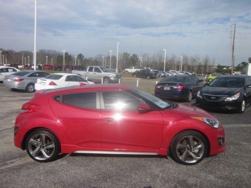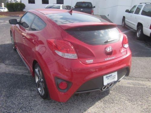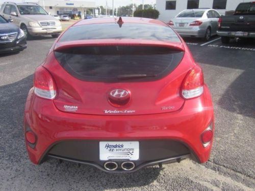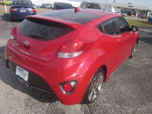 This 2014 Hyundai Veloster 3dr 3dr Cpe Man Turbo with Black Int Coupe features a 1.6L 16-VALVE TURBO 4-CYL Gasoline engine. It is equipped with a 6 Speed Manual transmission. The vehicle is Boston Red Metallic with a Black Leather interior. It is offered with a full factory warranty. - Air Conditioning, Cruise Control, Tinted Windows, Power Door Locks, Leather Shifter, Tachometer, Digital Info Center, Tilt Steering Wheel, Steering Wheel Radio Controls, Side Airbags, Keyless Entry, Security System, ABS Brakes, Traction Control, Dynamic Stability, Rear Defogger, Fog Lights, Intermittent Wipers, Alloy Wheels, Leather Interior Surface, aluminum block and head, full cover and hood insulator, Front-Wheel Drive, Heated Front Bucket Seats -inc: 6-way adjustable drivers seat with height adjustment, 4-Way Passenger Seat, Power Rear Windows, Selective Service Internet Access, Front Cupholder, Rear Cupholder, Remote Releases -Inc: Mechanical Fuel, Glove Box, Driver Foot Rest, Full Cloth Headliner, Interior Trim -inc: Piano Black Instrument Panel Insert, Leatherette Door Trim Insert, Leather Gear Shift Knob, Day-Night Rearview Mirror, Driver And Passenger Visor Vanity Mirrors with Driver And Passenger Illumination, Full Floor Console with Covered Storage, Front Map Lights, Fade-To-Off Interior Lighting, Carpet Floor Trim, Rigid Cargo Cover, Cargo Features -inc: Spare Tire Tire Inflator, Cargo Space Lights, FOB Controls -inc: Trunk/Hatch/Tailgate, Tracker System, Driver And Passenger Door Bins, Delayed Accessory Power, Power 1st Row Windows with Driver 1-Touch Up/Down, Outside Temp Gauge, Digital/Analog Display, Manual Adjustable Front Head Restraints and Manual Adjustable Rear Head Restraints, Engine Immobilizer, 2 12V DC Power Outlets, Air Filtration, black, Tires: P215/40VR18, Spare Tire Tire Inflator, Clearcoat Paint, Body-Colored Front Bumper, Body-Colored Rear Bumper with Black Rub Strip/Fascia Accent, Black Side Windows Trim, Body-Colored Door Handles, Rocker Pane ... HYUNDAI HAS THE MOST MODERN, ATTRACTIVE, UPDATED LINE-UP FOR 2012. GET MORE CAR FOR YOUR HARD-EARNED DOLLAR FROM HENDRICK HYUNDAI'S INTERNET SALES TEAM!