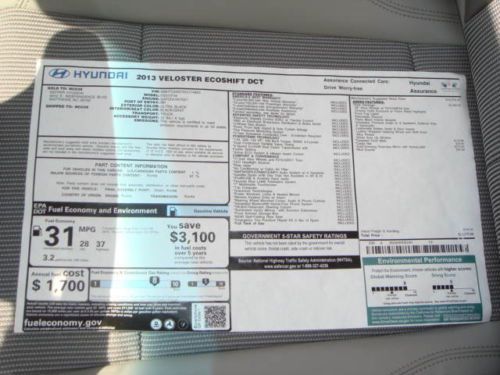 2013 Hyundai Veloster-1.6L-4 cylinder, p/w, p/l, c/c, tilt/telescopic steering wheel w/audio controls, auto, a/c, am/fm/XM/CD/Satellite, aux./USB inputs, ABS, (6) airbags, fog lights, 18 in. alloy wheels, p/mirrors, 3 door, panoramic sunroof, traction control. Remainder of factory 5yr/60,000 mile & 10yr/ 100,000 mile powertrain warranty. In service date 5/24/14.(See Owner’s Manual for Details)