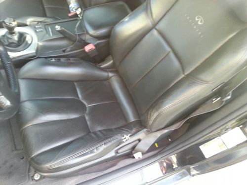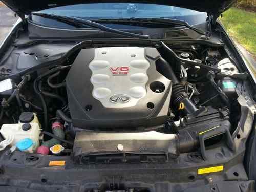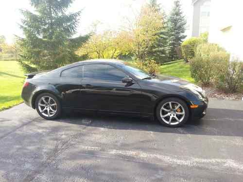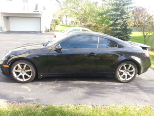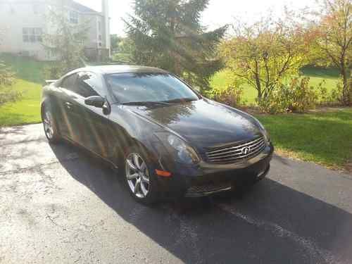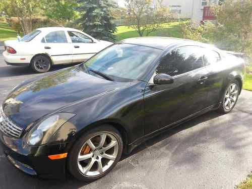 YOU ARE BIDDING ON A 2004 INFINITI G35 6 SPEED. THE CAR IS IN GOOD CONDITION WITH NO MECHANICAL PROBLEMS. THE INTERIOR IS IN GOOD SHAPE. DRIVER SIDE SEAT HAS A TEAR ON THE BOTTOM PART OF THE SIT WHICH IS COMMOM ON ALL THIS CARS. THE REST OF THE SEATS ARE IN GOOD CONDITION JUST NORMAL WEAR AND TEAR FROM A 9 YEAR OLD CAR. THE EXTERIOR HAS THE NORMAL DINGS AND SCRATCHES FROM A 9 YEAR OLD CAR. THE CAR DRIVES AND HANDLES EXCELLENT, TRANNY SHIFTS NICE AND SMOOTH. THE ONLY PROBLEM I HAVE NOTICED LATELY IS THAT ONE OF THE TIRE PRESSURE SENSORS MIGHT BE BROKEN BECAUSE AFTER YOU DRIVE FOR 20 MINUTES OR SO THE LIGHT COMES ON SAYING ONE OF THE TIRES IS LOW BUT WHEN I CHECK THEM THEY ALL HAVE THE RIGHT PREASSURE. TIRES HAVE PLENTY OF THREAD LEFT AND THE BRAKES ARE ALSO IN GOOD SHAPE. THE CAR HAS A LIEN WITH MY BANK WHICH MEANS THE TRANSACTION WILL BE DONE THROUGH THE BANK. THE REASON IM SELLING THE CAR IS BECAUSE I NEED A BIGGER CAR FOR THE FAMILY. ANY QUESTIONS FEEL FREE TO ASK. IF YOU LIKE TO COME AND SEE THE CAR IN PERSON I'M LOCATED IN GURNEE, IL.