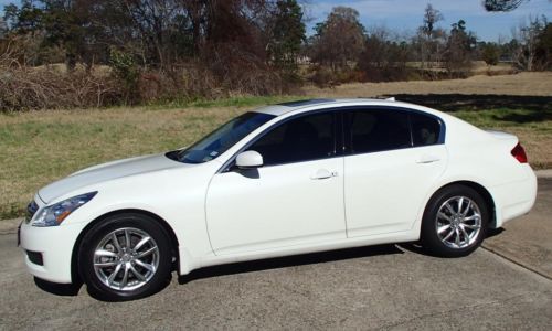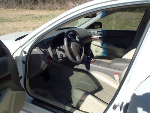 2008 Infiniti G35 4dr Sedan (3.5L 6cyl) with Pearl White Exterior, Lt. Brown Interior. Loaded with Premium Package, 3.5L V6 Engine, Leather Seats, Power Front Seats, Driver Seat Memory, Heated Front Seats, Leather Steering Wheel Trim, Cruise Control, Audio Steering Wheel Control, AM/FM/6-CD/XM Ready Audio System, Power Glass Moonroof, Power Windows, Power Door Locks, Power Exterior Mirrors, Xenon HID Headlights, 18 Inch Alloy Wheels and more.