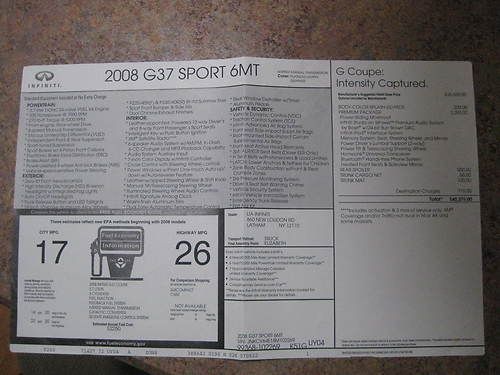 I am the original owner of this beautiful Platinum Graphite G37 Sport Coupe. I am meticulous about car maintenance and car care. I have every piece of paper since I bought this in Aug. of '07.