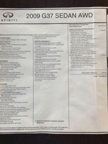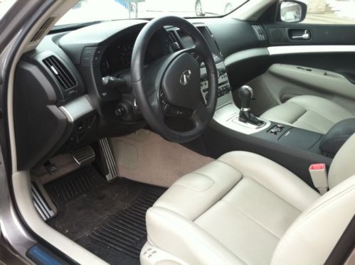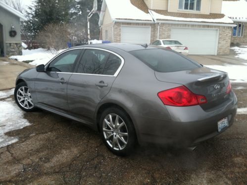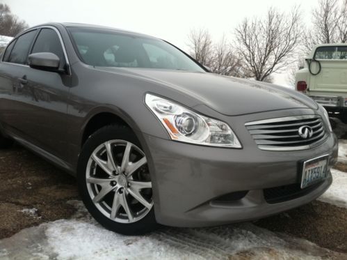This is a fully-optioned 2009 Infinity G37X Sport, all-wheel drive 4-door sedan. This car includes: PREMIUM PACKAGE (power moonroof, Bose premium 10-speaker stereo, iPod interface, memory seat, steering wheel and outside mirrors, power lumbar supported driver's seat, power telescopic steering wheel, auto-dimming inside mirror, Homelink, Bluetooth and one-touch up and down windows); AND SPORT PACKAGE (solid magnesium paddle shifters, 18-inch sport alloy wheels, sport front fascia and side sills, 12-way power driver's seat and 6-way passenger seat with sport stitching and aluminum sport accelerator, brake and foot rest pedals); AND Center-mounted pass-through door between trunk and interior for skis and other long items. It has just over 54,000 miles and is in pristine condition, no chips or scratches inside or outside. Leather and paint excellent, tires with at least 50% tread remaining. This car has always been garage-kept and is mechanically, structurally and exterior/interior superb! On Dec-20-13 at 13:07:13 PST, seller added the following information: New Cooper tires with only 4,000 miles. |