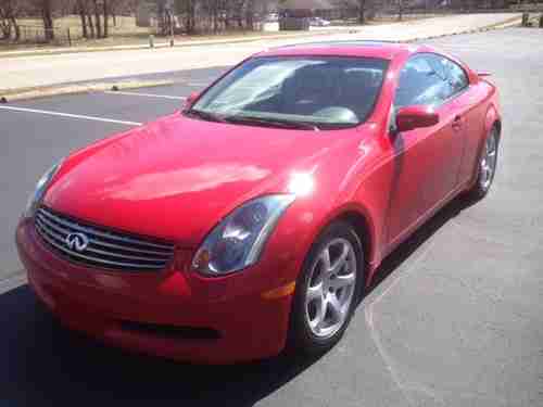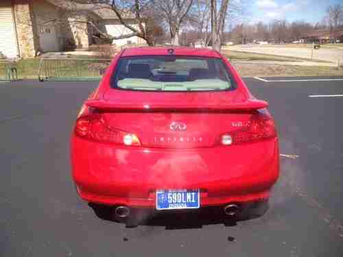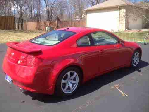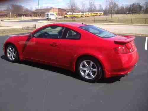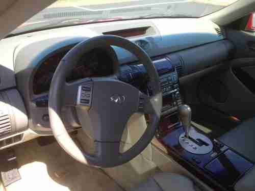 Infinity G 35 coupe, laser red / tan leather interior. Bose multi cd / cassette stereo, HID lights, glass roof, cruise, power everything, heated seats. Absolutely stock. Highway miles, single owner, Infinity dealer serviced with complete service records. Drives tight no issues, everything works. Clear title.