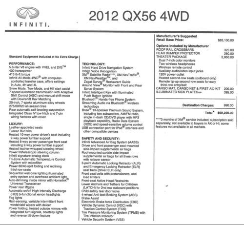 This 2012 Infinity QX56 is in amazing condition! One less than 1" scratch on back left near tire. Interior is gorgeous and this thing drives like a cloud. See receipt for ALL features.