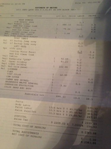 The QX56 has had had one owner and comes with the remaining factory warranty of 11 months. It currently only has 38,062 miles (I am still driving it locally until this is sold or I trade it in when my new vehicle arrives) and has an efficient and easy to use navigation system along with a rear DVD entertainment system for the kids. This car runs perfectly and has been kept up on all oil and maintenance. Why then do you ask is it priced so low? That is because when it was only a few months old and had a mere 10,000 miles on it, I was rear-ended at a stop light. There was only cosmetic damage to the rear bumper/lift gate. I have the accident report posted in the photos as well as the repair bill so you can see the details for yourself. There is absolutely nothing mechanically wrong with this vehicle - feel free to come and inspect. In the asking price I have figured in a $3,000 discount due to the accident as well as an additional 3k discount to make it more affordable to someone who wants a full size luxury vehicle. Please feel free to ask any questions or call to arrange a time to look at it.