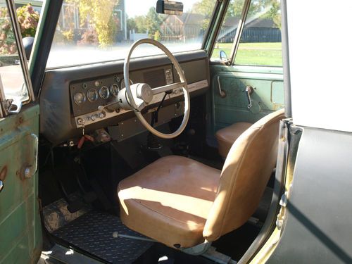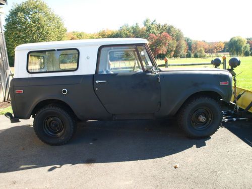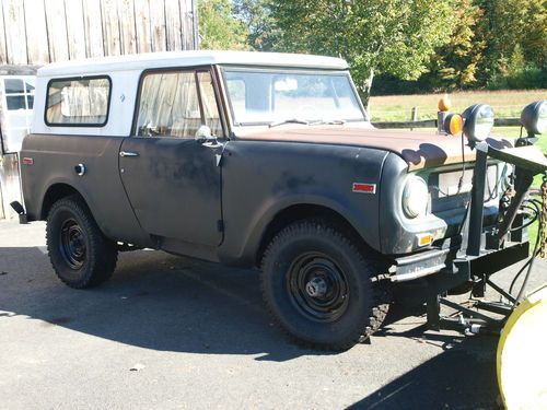 Farm vehicle, 1968 Scout 800, runs but would need work to be road worthy. Has nice plow on it, cables need adjusting or replacement, and I had planned to use on my driveways but lost interest. Has front working lights, no rear lights or brake lights. Brakes work,but have a small leak somewhere, fill with fluid, pump brakes and work ok. Has brand new tires, Cooper, cost me over $1000 and rims are real nice, have 5 rims. Has nice rear end, 100% rust free out of California. front panels are rust free as well, all california, spent $2000 shipping from Cali. Top is good shape, front window is old and needs replacement, doors are ok, dont close well, need adjustment. The only real rust issue was the under panels in the front being an original farm truck out of upstate NY. I replaced wheel wells rather poorly remanufactured with a metal brake but keeps the mud and water out of the engine area. New floor panels and door bottom panels from Super Scouts, about 800-1000 invested there. Gauges are all there, not all of them hooked up, small leak in gas tank somwwhere but holds plenty of gas, has 2 gas tanks Lots of useful parts on this vehicle. Most likely could use a carburator rebuild to run smooth. Currently runs rough, timing might be off. Have many extra other scout items including half top, great condition, front seat full (usually used on Scout 80s,), rear jump seat, mint and restored. Have front window rubber new from Super Scouts too that is included. And Original Hub Caps that fit the Scout 80 or 800 come as well. Sell for about $50 a piece these days.