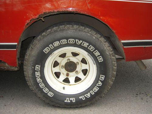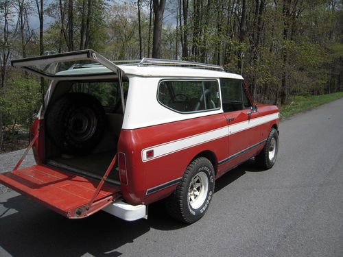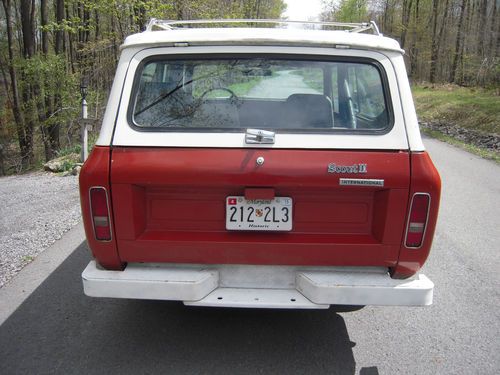 1977 International Scout II, currently garaged in western Maryland (Oakland, MD zip 21550). Equipped with the original 345 V8 engine, dual exhaust, Chrysler 727 TorqueFlite 3 speed automatic transmission, Dana 20 2-spd transfer case, Dana 44 front and rear, rear step bumper, front chrome bumper, luggage rack, rear sliding quarter windows, deluxe interior with original cloth bucket seats and center console, A/C (no longer used, needs work), pwr steering, pwr brakes. There is rust, visually the rocker and quarter panels are in bad condition, see videos on youtube; overview at http://www.youtube.com/watch?v=63muuDTJXHs , rust at http://www.youtube.com/watch?v=XA5RozirRpo , engine at http://www.youtube.com/watch?v=gcA-thPW0zs added starter button http://www.youtube.com/watch?v=opQQ85McpYw and 4WD http://www.youtube.com/watch?v=y97iced3YoM. Some body mounts were welded 20 years ago. Bondo work and painted in 1993 when it then won 2nd place stock at Scout Nationals. Also are rust spots around gas filler tube and lower corner of front windshield (driver's side), see pictures. Top's gutter showing some signs of rust in the back top corners (see pictures). Tires are very recent (see pictures). The vehicle runs very well. The ignition wiring circuit does have an intermittent fault so a starter button was installed to bypass the fault (see video). Newer (circa 1980) distributor for its electronic ignition installed to replace the original '77 elec ign on the firewall (see video). Some other added features are door grab handles, dome light, cup holders, roll bar (steel), CB radio, parts & manuals included (see pics), also has a locking ski rack. Top is metal, but the top lift gate is fiberglass. I bought this vehicle in the early 80's in CA and understood it was in Alaska originally. On-line photo appraisal done (copy available by request) by Scout Connection valued at $3,500-$4,000. So much of this vehicle is just great, except the rust, please see videos and pictures. Any questions feel free. No reserve. Sold "AS IS".
