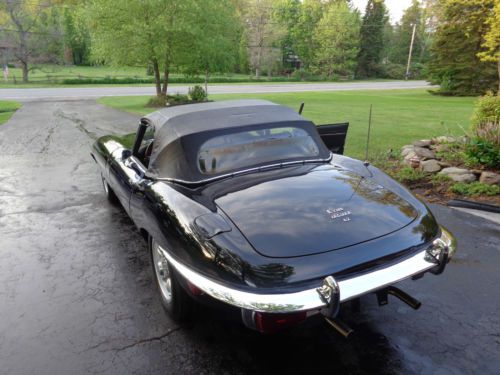 Very nice special order Jaguar E type, black on black, with full service history and mileage documentation from when it was new! The car was ordered new in Palm Springs, California. The first owner purchased the car on 5/27/1970 for $5,868.50. He kept a log book of anything done or bought for the car with date, cost and mileage. He keep the car till 10/24/1988 when he traded it in for a Ferrari. The second owner, also from Palm Springs, kept the car there till 2008. He also keep the log book, noting anything no matter how small that was done to the car. The third and last owner, who looked for a car like this for years, searched the country to find a rust free E type. He spared no expense on the car. The last owner did the following repairs done at the Jaguar dealership: All new rotors; rebuilt calipers; installed pads; replaced both master cylinders; changed fluids; replaced all fuel hoses; replaced all six shocks; replaced belts; replaced distributor, wires and plugs; replaced clutch slave cylinder; mounted and balanced 4 tires; replaced tie rod and ball joints; replaced all hoses; replaced coolant; replaced u joints; repacked wheel bearings and rear hub assemblies; drained and refilled transmission and rear end fluid; installed stainless exhaust system; rebuilt carburetors and much more. I have receipts totaling more than $14,000 in parts and labor. I believe that the third owner disconnected the odometer cable. I believe the mileage is still very close to stated miles. The work performed on the car was done in '09 and '10 with new tires which still have knobbies. The car was used very little after that time. I try to disclose what I know. The car has not been restored. It has had some touch ups over the years, which is also noted in the log book. The car comes with the factory hard top with a new rear window (not installed), all books, foot rest, homemade E type luggage, tonneau cover, never used spare, jack, tool roll and the original wire wheels. This all comes with the car. The car is number matching and matches the heritage report. The only defects on the car is the dash pad has a previous repair and a crack and the driver seat has a 2" split on the seam. Hard top will need some seals replaced and the rubber around the bumpers has some cracking. The car was just appraised and it was rated as a Number Two condition.