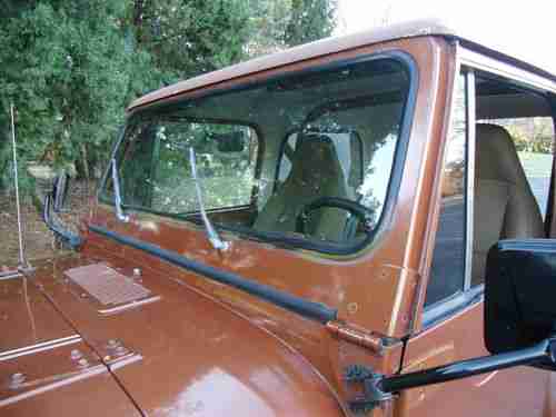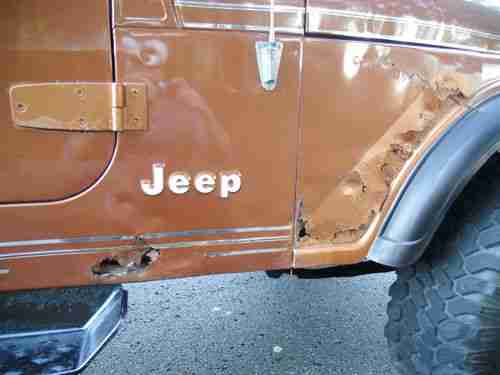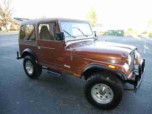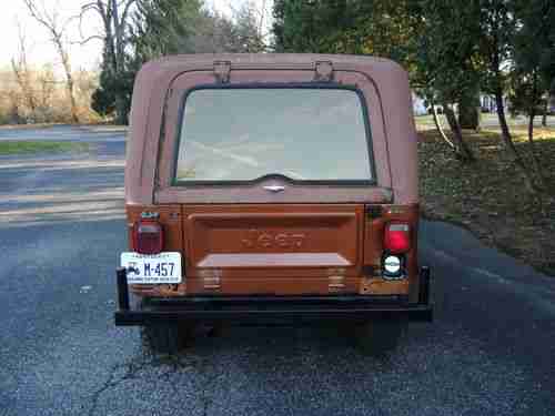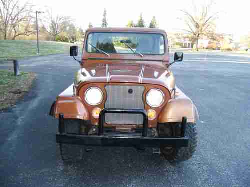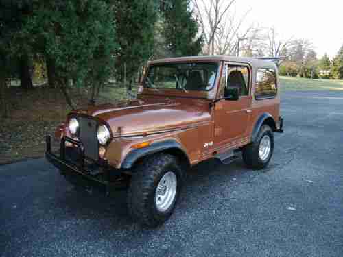 1981 Jeep CJ7- For sale is a really cool jeep cj with 167k miles on it...has the rock solid straight six cylinder 4.2 liter engine with the 4 speed manual transmission. This Jeep was one family owned for 32yrs and is all original. Has the hard top and full hard doors. Only thing that is not stock is couple year old baja wheels and 31 inch pro Comp off road tires...newer best top front seats...also has after market front and rear bumpers. Runs and drives really good (heater works awesome) but does have the typically underbody and tub rust....rusted thru spots on quarters, rear of jeep and driver floor board. This Jeep has not been cut up, patched or diamond plated over like most unrestored jeeps of this age. Had $600 worth of brake work done less then year ago (pads drums, master cylinder etc) and tires/ wheels less than 2 years old with 75% tread life (rims and tires $1500). This is a great old jeep in the original Copper Autumn color that you could either leave as is and have fun with or restore over time!! I took a ton of pictures so make sure you know what you are buying again this Jeep is all original but does have the rust issue you see in pics. Here is the list of the other issues with Jeep- does have a tendency to pop out of 2nd gear if you don't keep you hand on shifter...doesnt do it going down the road put when you are down shifting (mechanic I took to says it is syncronizer rings but suggested not to replace until it needs a new clutch) not a concern for me so didn't fix. The gas gauge does not work (again had looked at and said sending unit for gas needs to be replaced. Also the E-brake line needs to be replaced, cheap fix just didnt didnt do it because I don't use it. This all are common issues with this older jeeps and pretty inexpensive fixes. This Jeep fires right up very easy and is truely a solid old jeep. I will be posting a You-Tube clip of going thru jeep, starting cold, driving, shifting etc so will give you some more peace of mind with this auction. Please feel free to shoot me any messages that you may have with this jeep.