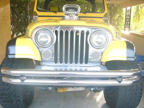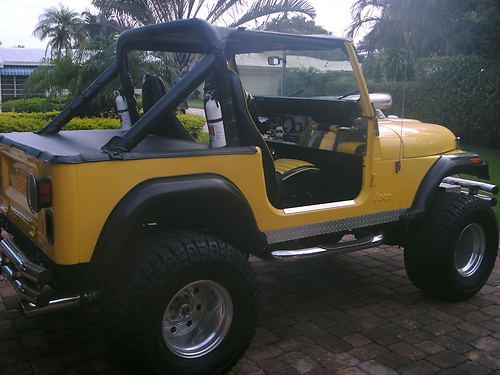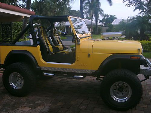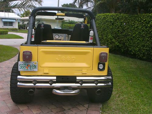 I'M re listing my jeep because the high bidder was a scam so please don't bid on my jeep if that is the case it's just a waste of time. This CJ is in great shape and is a great jeep to drive come's with a 4' lift kit that sit's on 33x1,450x15 tire's with weld racing rim's ,it has 4.point seat belts,all new gauges,b&m shifter with shift kit,race tack, matching seats,electric fuel pump with fuel regulator that run's regular gas,msd 6al ign with retard boost,am/fm/cd player with boom box in back and set of 8 speekers,bikini and back seat covers.This jeep is in great condition and all metal body.will be willing to trade for 1967/69 convertible camaro for more info please call Steve at 954 655 9080 thanks