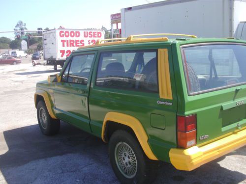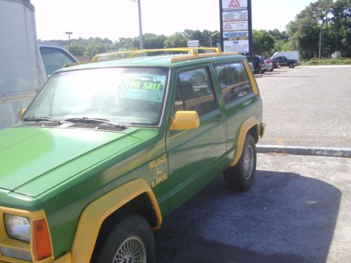 this is a strong running jeep clean of rust but weak on paint &so i just couldn`t help myself ( i had gal of free John Deer paint &some yellow left from another job ) SO here it is all you deer LOVERS have a jeep to match your tractor.as i listed the engine had noise &i had spare engine that had been overhauled before being wrecked so i installed &all the running gear is strong of course i ck`d everthing out before going to the cost of engine change.interior is ingood shape no rips or tears&new head linner tires are RWL aprox 60 %.A/C is ice cold .it starts right up every time &shifts though gears smoothly no noises in drive train,any questions call stu @904-614-5452