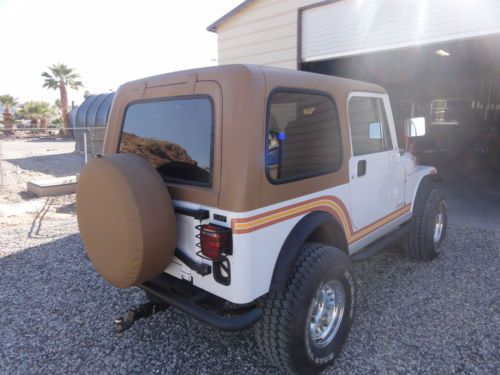 I'm selling my really nice 85 CJ7 its in realy nice condition. I have it at my river house near parker AZ and I just use it to launch my boats I have purchased a new Jeep and no longer have a need for this one I had the engine converted to EFI with the California leagle HOWELL Injection System It really ramped up the performance and reliability it has a removiable Hard top and I have a soft top and a bikini top that goes with it I have removed the tan&yellow stickers from the vehicle the kids thought that it looked to ken&barbie Good luck Bidding someone is going to get a nice Jeep call if you have any questions (714) 916-1808 Dennis