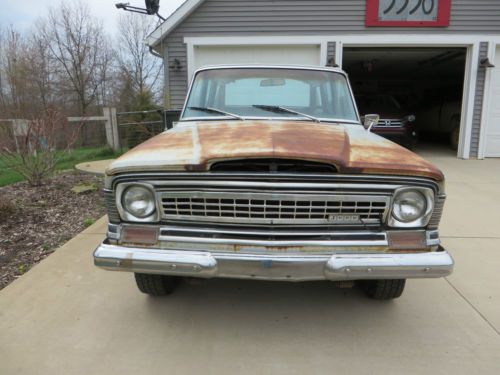 There is surface rust on the flat surfaces of this vehicle but it is not rotted through, it is more of a "patina" some might say. There does not appear to be any filler in the body, all of the chrome and stainless bumpers, emblems, and trim are in great, rust-free condition and all there. This Jeep starts, runs, shifts, and drives great, it is a pleasure to drive and is dependable as an every day vehicle. This would provide an excellent foundation for a restoration or can be driven in its original state. I believe that I have listed everything to the best of my knowledge, please ask questions and I will provide additional photographs if requested. This is an as-is no reserve auction, the buyer is responsible for shipping/transportation. This is a 40+ year old vehicle that has not been restored, please look carefully and ask questions. Should there be winning bid, please contact me within 24 hours of the auction's end to make arrangements, I am willing to work with anyone on the details. |