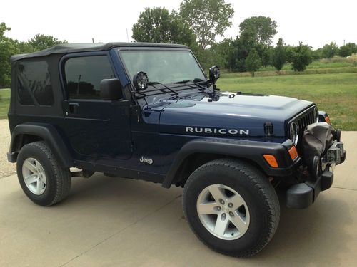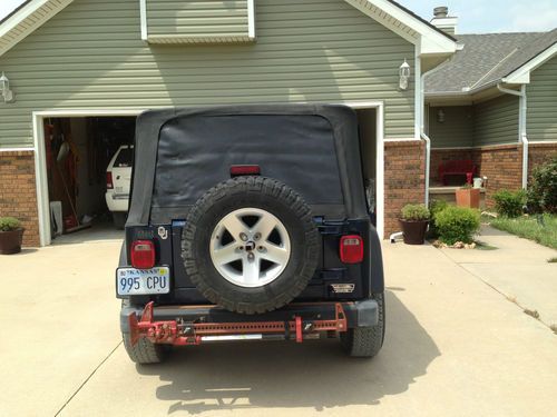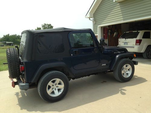 Up for sale is my 2003 Jeep Rubicon. I purchased this vehicle new and it was one of the first Rubicon models in Wichita. As stated in the options, I am including both a soft top (pictured), hard top, 2 bikini tops, and a set of GoodYear MTR 245/75-16 tires mounted on Pro Comp Black steel wheels - (they are about 45% tread depth). I also have an Olympic Spare Tire Rack (not pictured) that will be included as well.