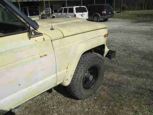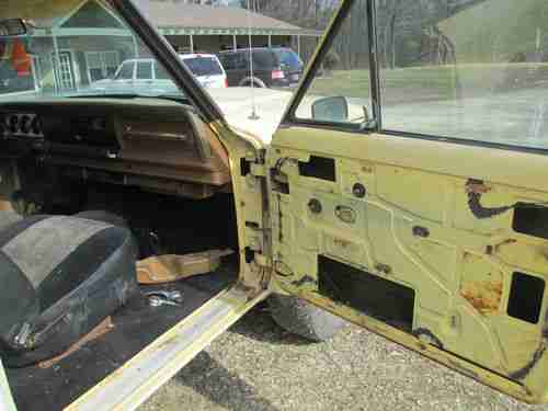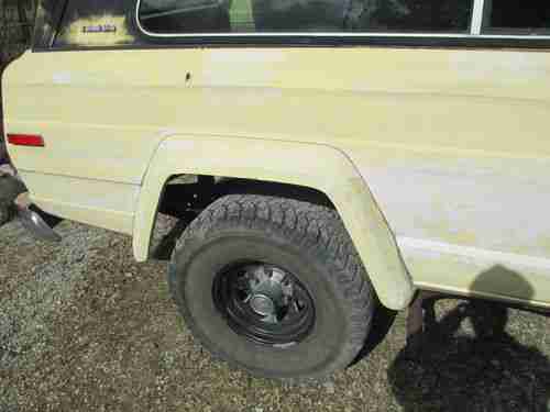 This is a rare 1979 Jeep Cherokee. It has an AMC 360 V8 motor. It is full time four wheel drive with an automatic transmission. The odometer reads 60449 but I'm sure that it has turned over and is 160449, though I do not know that for sure, neither did the previous owner. The title states that the odometer has exceeded mechanical limits. It has a 3" body lift with 33" tires on 15" rims. I have installed new brake calipers on all 4 wheels with new pads as well. There is very little rust on the body but the floor boards had quite a bit of rust damage and the previous owner patched the damage with metal. The previous owner decided to remove the big stock mirrors and installed small mirrors, so there are screw heads where the old mirrors mounted. There is one small rust hole in the hood and a little surface rust near the wheel wells, but other than that the body is rust free. There are some small dings and dents in the body as shown in the pictures. The windshield has a crack in the driver side. The previous owner installed a custom front bumper with a grill guard. The previous owner also installed new black carpet and seat upholstery. I have let the Jeep sit long enough that mice have damaged a little bit of the carpet as shown in the picture. The dash needs some work as it is cracked and the gauges have shifted out of place. The fuel gauge does not work. I'm not sure if its the sending unit or the actual gauge. There is no headliner. I have the passenger door trim, it is just not installed. The rear gate has an electric window that works and the gate folds down. The engine has new Edelbrock intake and carburetor, new battery, new spark plugs, new spark plug wires, new starter, new master cylinder, and new starter solenoid. It does have some blow by so the engine smokes a little at idle and the valve cover gaskets leak a little causing smoke in the engine compartment. The engine starts and runs good, unless it has sat a while. If it has sat for a couple days, it takes some time to start it. I haven't had the carburetor tuned since I installed the new carb, so a tune up may help. The transmission shifts smooth and seems solid. The Jeep drives good on the road. Its a fun vehicle to own and drive, I just don't have the time to give it the TLC it deserves.