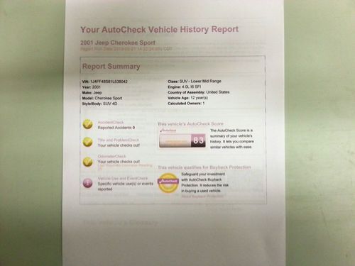 FOR SALE IS A 2001 JEEP CHEROKEE SPORT 4 DR. 4X4. THIS TRUCK HAS ONLY 72,000 MILES, HAS BEEN IN VA. SINCE NEW. I BOUGHT FROM ORIGINAL OWNER. HAVE ALL SERVICE RECORDS SINCE NEW. AUTO CHECK SHOWES NO ACCIDENTS OR OTHER PROBLEMS. HAS ALL OF ORIGINAL PAINT, NO RUST ISSUSES ANY WHERE.HAVE ALL OWNERS BOOKS AND 2 SETS OF KEY AND REMOTES.IT SCORED A 83 OUT OF 100 ON AUTO CHECK REPORT. (SEE PICS.) THE INTERIOR IS NICE AND CLEAN WITH NO DAMAGE ANY WHERE. CARPET AND SEATS ARE ALSO NICE AND CLEAN. HAS POWER WINDOWS AND DOOR LOCKS, CRUISE CONTROL AND TILT WHEEL. TIRES ARE ABOUT 60% TREAD LEFT. HAS MATCHING SET OF FIRESTONE WHITE LETTER 225/75/15 FULL SIZE SPARE THAT HAS NEVER BEEN DOWN. UNDER CARRIAGE IS ALSO NICE AND CLEAN, AGAIN NO RUST ISSUSES.THE EXTERIOR PAINT IS GOOD ONLY A FEW LIGHT SCRATCHES, NO DENTS OR OTHER DAMAGE. DOES HAVE A SMALL ANTENNA ON ROOF, NOT SEEN ON INSIDE HEADLINNER. TRUCK RUNS GREAT WITH NO ISSUSES. AGAIN HAS HAD ALL SERVICES PERFORMED EVER 4,000 MILES. HAS JUST BEEN SERVICED AND VA. STATE INSPECTED.THESE 4.0L IN LINE 6 CYLINDERS MOTORS RUN FOR HUNDERES OF THOUSANDS OF MILES. THIS ONE IS JUST GETTING STARTED. THIS IS A NICE CLEAN JEEP THAT RUNS GREAT AND NEEDS NOTHING.