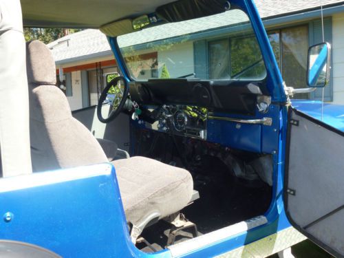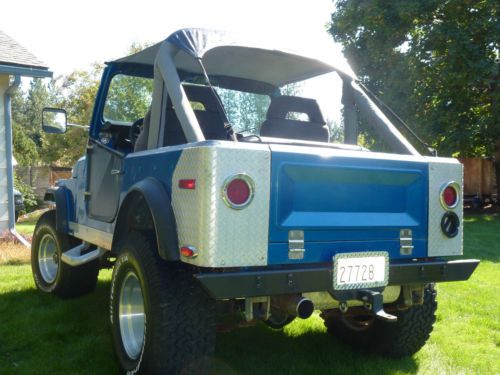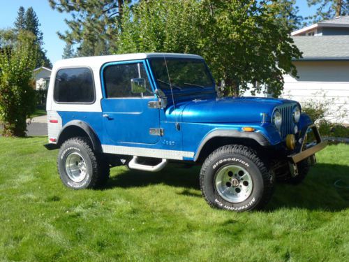 1977 Jeep CJ7. Engine type- AMC Big Block 360. 3 Speed Manual Transmission. Grey Hard Top with Hard Doors. Black Soft Top and Soft Doors. Black Bikini Top. Body Color- Competition Blue w/ Metallic Flake. 4 inch lift kit, including Rancho Shocks and COMP Springs. Tire Size 33x12x50 BF Goodrich All Terrain 95% Tread. 15inch Alloy Grambler Rims. 44 Dana Rear and Front end. Steel Horse Side Steps. Diamond Plate finishes. Car has absolutely NO rust. Z-Bart Undercoating on entire vehicle. Black interior carpet. Custom Bumpers Front and Rear with Hitch. KC Spot Lights. 4 point roll cage w/ dark grey vinyl sleeve. Super Tuner Deck w/ Pioneer Speakers. Over 12,000$ invested. Will include an extra White Hard Top.