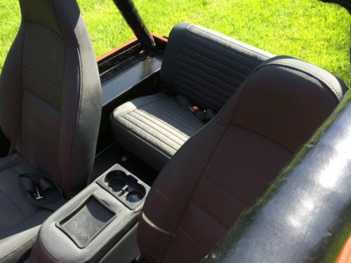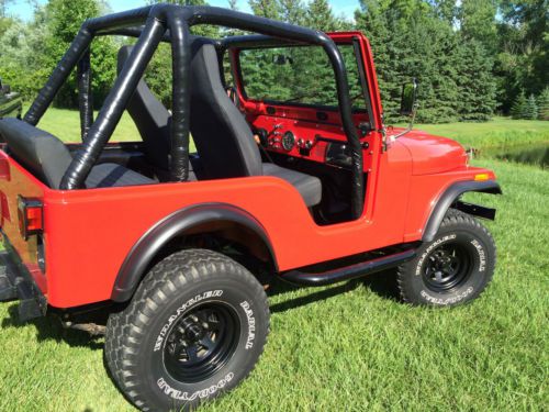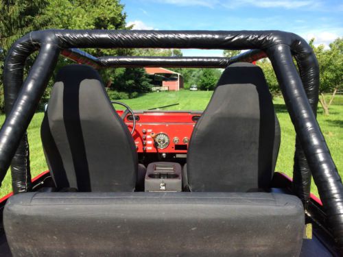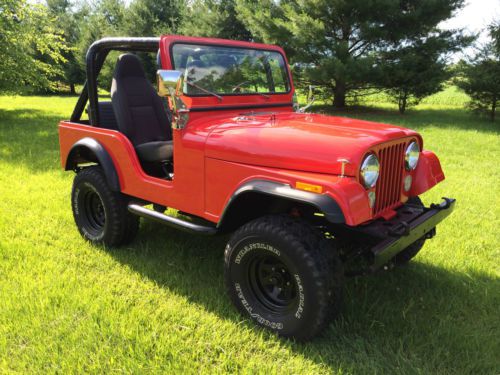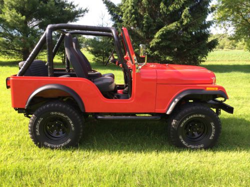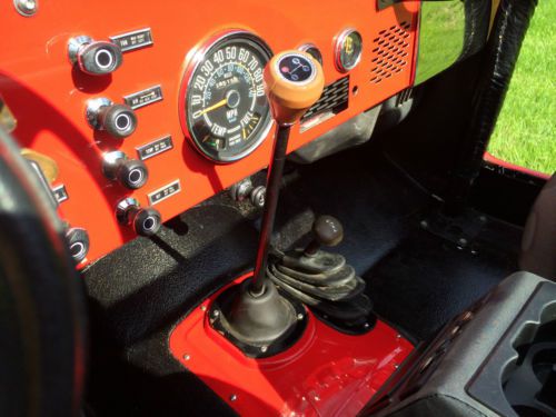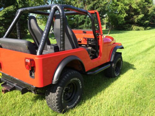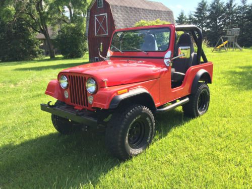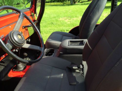 Looking at a 1978 Jeep CJ5 The Jeep has a trailmaster 4" lift, new exhaust, new gas and brake lines and hoses, new radiator, new stainless mirrors and hardwhere. The body is from 4 Wheel drive hardware and is fiberglass as are the fenders, the hood and grill are the original steel. The Jeep is painted with PPG porsche red. Also has all new lights except the head lights. Has a receiver hitch and a new gas tank and sending unit. The seats are after market I bought used besttop there is a small rip in the drivers seat please see pic. The back seat is beige with a black cover. All heat control cables are new. Both drive shafts are new. The inside of the tub has been coated with a after market bed liner. The Jeep has a 232 straight six with a three speed manual trans. Jeep runs and drives well. Things it good use no top we the jeep as a toy so never purchased a top didn't need it. Tires are old and should be replaced. Has an oil leak not sure if its from the valve cover or rear main.