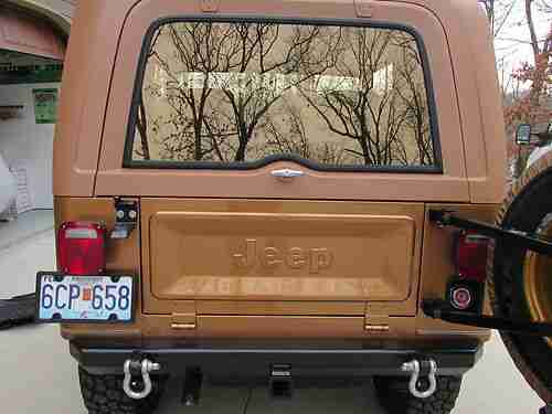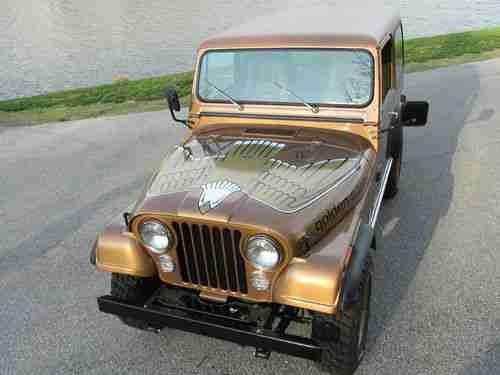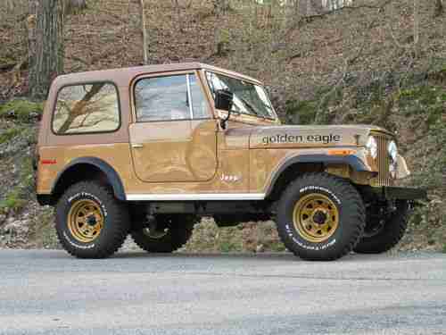 This is a 1980 CJ-7 Jeep Golden Hawk/Eagle. All body parts removed, sanded,primered and painted with 3 coats of clear. This is a fresh restoration. No drips,dents,scratches,errors. Finished in Alpaca Brown metal flake with completely all new OEM graphics and equipment. Numbers matching, 89,892 miles on chassis. Engine has less than 100 miles. Motor totally rebuilt using stroker package to upgrade to 4.6 liter. Engine package from 505 Performance Company. Crank and rods are forged with hyperectic pistons. Suspension is all stock new leafs/shackles/bushings. New drums, brake cylinders,pads,rotors and master cylinder. New Saginaw steering box with flaming river steering shaft. New heater core with complete removal/cleaning/painting of fan box. All new dash lights with cables. Guages are original. New clutch assembly from pedal to clutch disc. Hardtop and doors in excellent shape with new seals. All glass in great shape. Doors/windows have new weatherstriping and channels. New windshield and cowling.Exhaust new from manifold to tail pipe. Wheels have been sandblasted and pinstriped. Basically, I have returned the vehicle to showroom condition. All replacement items are OEM with emphasis on originality. New upholstered custom seat covers, rear seat is original and in great shape. Inside tub is Dura-Bak with two coats. Under-carriage has been cleaned and detailed. I have spent last 1.5 years returning it to this level. All reciepts. Enjoy the pictures and if you have any questions call Rogers at 573-220-4285.
