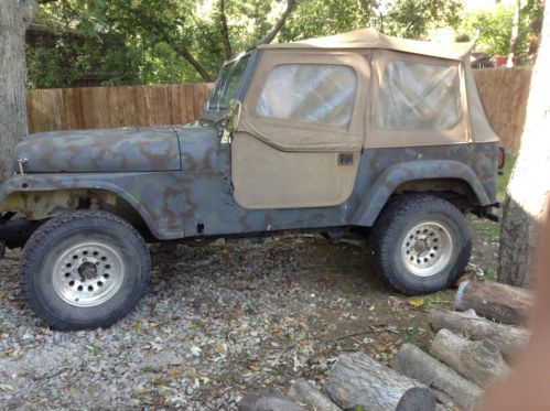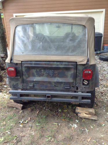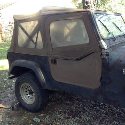 This is a PROJET or a hunting Jeep. I've had the engine running, but it needs a carb. rebuild or a new carb. It runs good, no smoke or knocking. I'm selling it as not running! We can start it when you pick it up, but we'll have to use carb. cleaner. It has tub rust in the usual Jeep places. It would be a perfect cantidate for a fiberglass or a YJ tub. The right fender, hood, grille have no rust. The left fender has some bubbling. The tailgate looks ok. It has the 258 6 cyl. with a T5 5 speed transmission and Dana 300 transfer case. The frame is in good condition with no rust holes and no repaired places. The transmission shifter is tight, and the 4WD works. It has a supertop in fair condition. It also has the factory 20 gallon gas tank. Stainless windshield and hood hinges. New starter, starter solenoid, plugs, wires, HEI distributor, battery, fuel pump. It'll come with a used standard steering column out of a 86 CJ7 (someone bypassed the key switch in the current one and installed a pushbutton start). Low reserve!!!