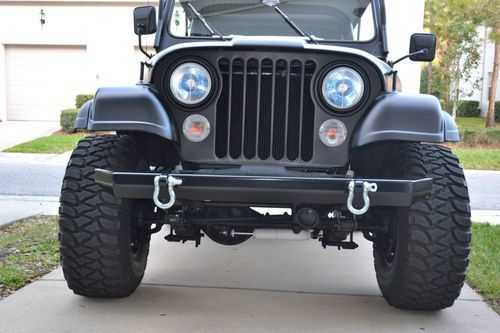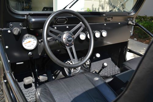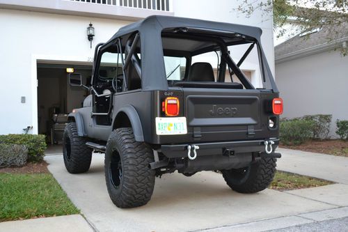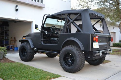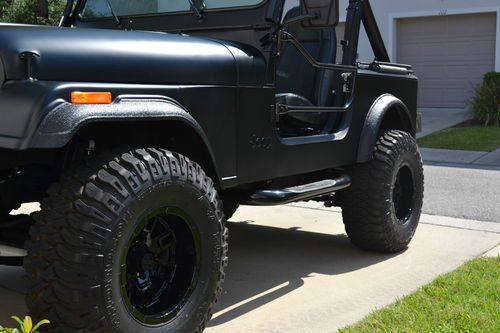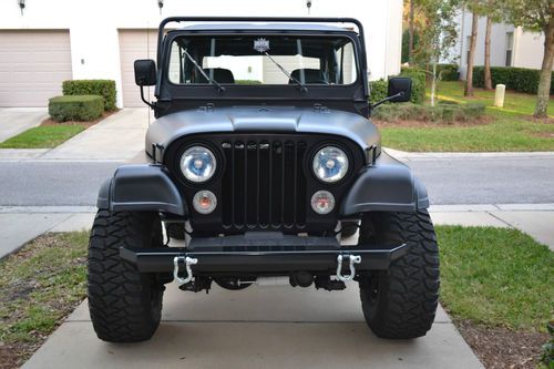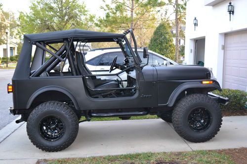 This Jeep is unlike any other! Looks New, runs New! I purchased December 2011 in original condition without any rust. This CJ7 has been stripped down, undercoated, Line-X interior, Matte Black paint job. 4-cyl converted to Chevy 350, headers, quadrajet 4 barrel carb, dual straight pipes to flow master 40's, chrome kit, new radiator, new power steering, new power brakes, new drive shaft, Dana 44 rear, 4 speed, 21 gallon gas tank.......fast & sounds awesome! 3.5" Skyjacker lift with 1" body lift.....4.5" total lift. Original CJ embossed vinyl seats. Custom dashboard with phantom gauges. Brand new tinted Best Top with soft doors. Safari tube doors option for summer. Padded roll cage. Custom center-console with lock and new bluetooth stereo inside. Polk Audio speakers two 3X5 up front two 6X9 in Back. New LED tail-lights, new turn-signal lenses, 2010 Jeep Halogen headlights. Mickey Thompson rims and Mickey Thompson MTZ tires 33"X12.50 R15. Rock crawler bumpers with D rings. Tube step bars, Tube light bar. towing capacity 750lbs.....have custom rack for tow fitting to carry Kayaks and surfboards. New visors, new mirrors, new windshield wipers. You need to see it and drive it to fully appreciate it. Make an offer.....I have 28K invested.