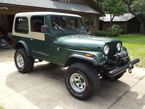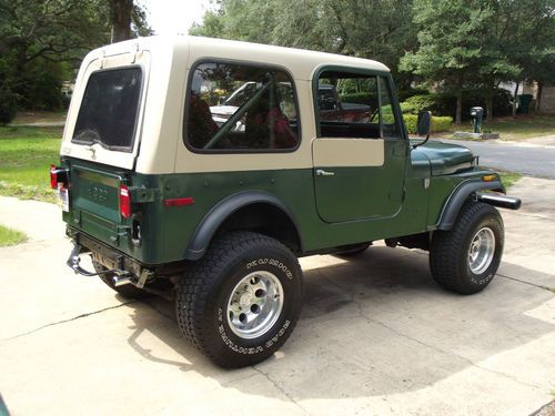 UP FOR AUCTION IS A CLEAN 1979 CJ7. THE JEEP HAS A 304, DISC BRAKES, 3 SPEED TRANNY, AND A NEW 4" EASY RIDE SUSPENSION WITH NEW TIRES AND RIMS. I AM THE 3RD OWNER OF THIS JEEP. THE SECOND OWNER IS A GOOD FRIEND OF MINE WHO BOUGHT IT OFF A CAR LOT IN THE EARLY 80'S. THE JEEP HAS A RAMSEY WINCH THAT WAS ON IT WHEN HE BOUGHT IT. THE DOORS ARE NOT IN THE BEST OF SHAPE DUE TO NORMAL WEAR AND TEAR. THERE IS ABSOLUTLEY NO RUST ANYWHERE ON THIS JEEP. THIS JEEP IS NOT THE QUADRAJUNK VERSION THAT WAS POPULAR IN 1979.THE JEEP IS PICK UP ONLY AND IS ALSO FOR SALE LOCALLY PLEASE CALL 850-259-5464 WITH ANY QUESTIONS. THANKS FOR LOOKING AND GOOD LUCK.