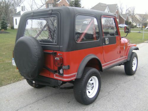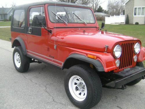 1982 JEEP CJ7 RENEGADE PACKAGE 9K ORINGAL MILES AMAZING ! We purchased this ultra low mileage CJ7 from the original owner. The title indicated new when we obtained it. It has original AMC belts, hoses, exhaust, converter, smog equipment etc,,,,,,It even had the original tires which were dry rotted. The paint is mostly original with some touch up on the front end and misc areas, however the inside of the tub and floor pans are original. The photos of the inside the tub have never been re-sprayed, that is the true factory coating indicating the amazing condition of the body. Rock solid and never any patch work present. The motor is original AMC blue and you can find the AMC stamp in many areas, radiator hose, drive belts, heater lines, air pump etc. The only alterations was a replacement of the carburetor. The length of storage line caused issues with the original, therefore it was replaced with a remanufactured carb. It starts and runs like you would expect for a vehicle with 9k original miles. The motor is super strong running. The clutch, 5 speed manual, and 4x4 feels new. The frame is rock solid perfect. The interior is all factory. The seats are almost perfect. There is one flawed spot on the rear seat. The dash pad is original too and looks great with no flaws. All the gauges function OEM clock, Tach , Fuel gauge, temp, speedometer, volt, and oil pressure function as intended. It has a factory tilt wheel too. Original spare tire jack and owners manual. Factory AMC JEEP AM/FM radio system and speakers work and sound outstanding !! The top and doors are amazing. The windows roll up so easily and have no stress cracks etc. The same key works the doors, ignition and rear hatch on the hardtop. The wheels and center caps are factory as well. All glass panels are clear and appear to be original equipment too. Overall, this is an incredible find and a great investment as there can't me too many CJ out there with less than 10k in existence. If you are local and wish to review in person, please let me know. I'm starting the price out a very reasonable amount so don't miss out ! A $500 non refundable deposit will be required to secure the Jeep at auction end. Once paid for in full, you will receive a clear title for you to transfer ownership. Thank you and good luck and enjoy the photos !