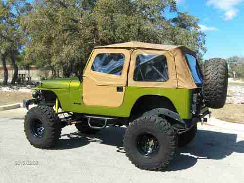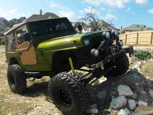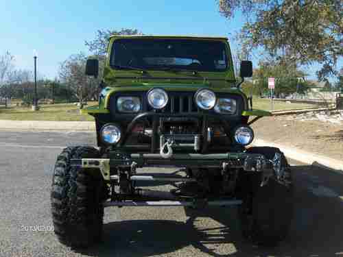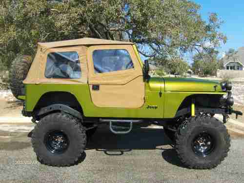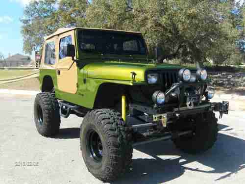 1990 Jeep Wrangler YJ that is “tricked-out” and ready to hit the trails, rocks, mud etc. It has a newly replaced/ remanufactured 4.2L 258 6 cylinder that idles smooth and doesn’t smoke. The engine is stock except for a header that doesn’t leak and a weber carburetor. It also has a newly replaced/ remanufactured AX-15 5- speed transmission with less than 1K miles that includes a new heavy duty clutch, throw-out bearing etc. (warranty & receipts avail.) This Jeep has approx. 1’ of lift (aftermarket springs & shackles on top of the diff.) and rolls on 36” Super Swamper’s with less than 2K miles (see mold nipples in attach. pictures). This Jeep has no signs of rust (CA/AZ Car Fax) and has a fairly new paint job that I’d rate 8/10. It’s not show quality but something you can use and not worry about. This Jeep has aftermarket sway bars up front and tracks down the road with no pull or sway considering the height & size of the tires. The front & rear differentials were both rebuilt and/ or gone-thru and resealed to include aftermarket drive shafts that were custom made/ measured to accommodate the height & lift (no bind). The 4 wheel drive diff. case was just inspected and all gaskets and seals replaced (<1k miles ago when I replaced the tranny). This Jeep has a swing-out rear tire mount that is very nice/ heavy duty with a used spare tire, trailer hitch and two large “U” bolts to hook-up too if needed. The front bumper has a 9K lb. Ramsey winch w/ PTO, 4XRAC Jack w/ mount and four large flood lights that are all operational. This Jeep just passed a TX State Safety Inspection last Oct. so everything works, i.e. lights, blinkers, horn etc. and DOES have a catalytic converter for those states like CA. This Jeep does NOT have fenders (for extra clearance) so check with your local and state laws prior to bidding/buying. The soft top is in good condition with no rips, tears and very few scratches on the clear plastic windows. The interior carpet is fairly new and in great condition and it has a very nice lockable center console. The two front seats are XRC Smitty Built seats that are in great condition and a rear seat that looks practically new. This Jeep has a 6 point roll-cage and an Alpine stereo/ CD player w/removable face and 4 speakers (rear 6x9 BOSE speakers mounted in Jeep aftermarket corner boxes). This Jeep DOES have an Air Conditioner which is COLD and a clear title history via “Auto Check” which I will try to attach or is available upon request. The Auto Check Report doesn’t show any major accidents and or concerns and looks like it spent most of its life in CA, AZ, NM (dry climates) and the original odometer (150K) appears to be accurate. I bought this Jeep to replace a CJ-7 that I had for 25+ years and would love to keep it but the wife is nagging-me and it won’t fit in the garage (too high). I’ve been driving it almost daily to work-out the bugs and would still like to fix a few minor things such as the lights on the dash board and a small oil leak (1-2 drips ea. stop). The gauges all work but the background light does not work on the RPM gauge and the clear plastic overlay on the smaller gauges is missing. You can find the gauges on eBay for 50-75 bucks or go with an aftermarket set-up for $200 which is what I wanted to do. Based on past experience, the oil leak is probably coming from the valve cover gasket near the rear and may be fixed by the time it’s sold. This vehicle is mechanically sound and will go anywhere. Feel free to message me and I will give you my phone number so we can talk and discuss the vehicle. Serious inquiries only.