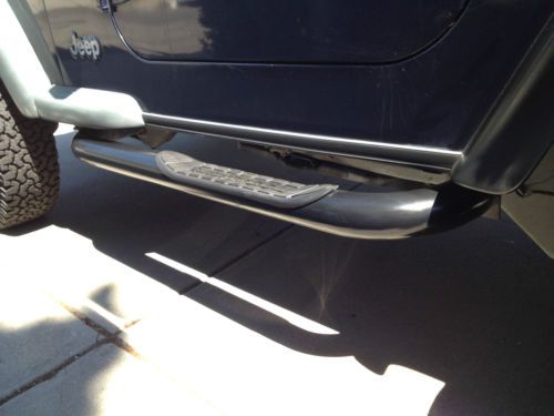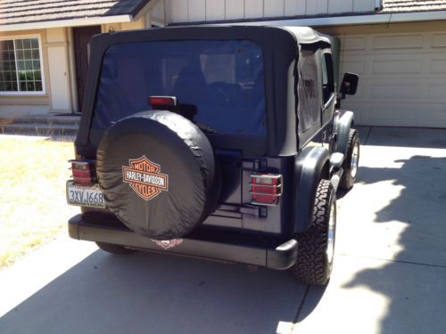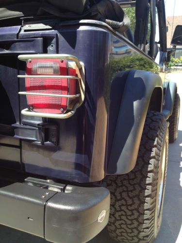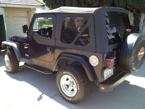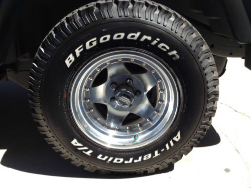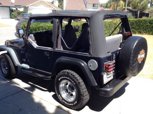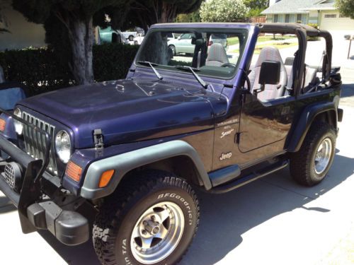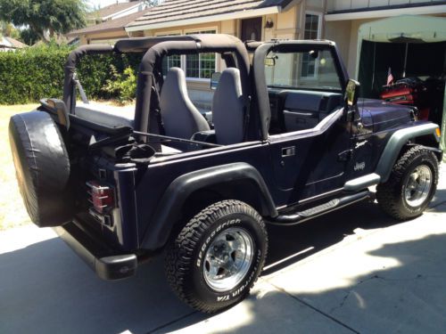 There's a reason Jeepers wave at each other on the road. They know the secret: Jeeps are so much fun to drive! This is a dark blue 1998 Jeep Wrangler Sport 4.0 liter, 6-cylinder engine with a manual 5-speed transmission. This 4-liter engine is far superior to the smaller 2-liter version. Very responsive and accelerates very fast. The convertible top is quick and easy to take down and put up -- or -- just take off the doors and side panels for a shady ride in the wind. This vehicle is great for commuting or driving up the coast along highway 1. To drive off-road or on snow, simply engage the 4-Wheel Drive by pulling a hand lever while driving (no need to get out and lock the hubs). All Terrain tires have deep tread. Two tires have only 4000 miles on them. Loaded with extra goodies, including heavy-duty front grill bars, front and rear blinker protective grills, heavy-duty running boards, custom wheels, locking gas cap cover, and spare tire cover. Stereo is less than a year old and has detachable faceplate. Convertible top was replaced a few years ago and is in very good condition. Rear side and back windows are tinted. |