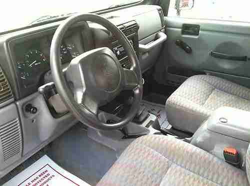 I HAVE A 1998 JEEP HAS A 4.0 6 CYLINDER ENGINE AND 5 SPEED MANUEL TRANSMISSION. THE JEEP HAS 182,000 MILES ON IT. THE JEEP HAS ICE COLD A/C,HOT HEAT AND A CD PLAYER. THE JEEP RUNS AND DRIVES LIKE A NEW ONE. THE MOTOR IS IN GREAT SHAPE AS WELL AS THE CLUTCH. IT STILL HAS GOOD POWER AND GET UP AND GO. THE INTERIOR ON THE JEEP IS IN GOOD SHAPE IT JUST NEEDS TO BE CLEANED. THE TIRES ON THE JEEP WILL NEED TO BE REPLACED BEFORE LONG. THE PAINT ON THE HOOD IS CRACKED,BUT THE PAINT ON THE REST OF THE JEEP IS IN GOOD SHAPE JUST NEEDS WAXING. IT DOES HAVE SOME SCRATCHES AND A SMALL DENT ON THE PASSENGER REAR SIDE, THAT YOU CAN SEE IN THE PICTURES. THE WINDSHIELD ALSO HAS A CRACK IN IT AND THE BACK OF THE TOP PLASTIC HAS A CRACK IN IT. "THE JEEP HAS NO RUST'. I JUST REPLACED THE MUFFLER GASKET AND IT HAS HAD A FRESH OIL CHANGE. IF YOUR LOOKING FOR A GOOD JEEP HERE IT IS. "I AM A DEALER SO I CAN STOP THE AUCTION AT ANY TIME IF I SELL THE VEHICLE ON MY LOT. IF YOU HAVE ANY QUESTION AT ALL ABOUT THE JEEP FEEL FREE TO CALL 662-562-0285 I HAVE TRIED TO BE AS HONEST ABOUT THE JEEP AS I CAN.
