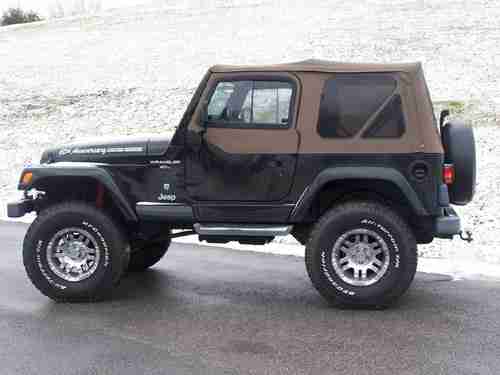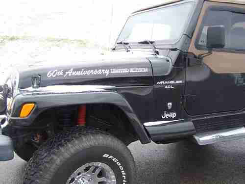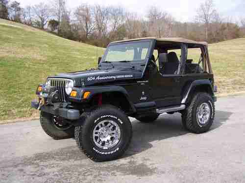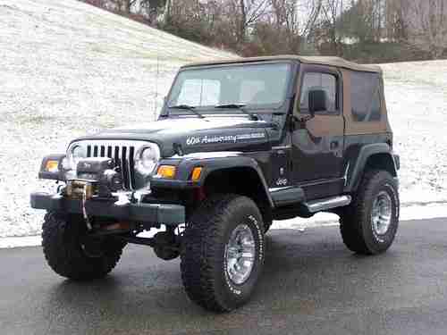 2001 Jeep Wrangler 60th Anniversary Edition. New tires, custom wheels, and new soft top. The tires are BF Goodrich All-Terrain T/A LT315/75 R16's. The wheels are Moto Metal 16" chrome. 6" Rough Country lift kit. The winch is a Mile Marker SI 9500 with remote. Automatic. Tilt Wheel. Cruise Control. Air Conditioner. CD player. Half doors with sliding glass windows. Runs and drives perfect. I drive this jeep at least twice a week. Never been wrecked. Never been abused. I mostly drive this jeep during the summer and leave the top down and park it in my garage at night. This thing is a blast and by far the best toy I've ever owned. Check engine light is on and so I had a diagnostics ran on it and the results were that an oxygen sensor is out. Haven't had time to get it fixed, but will attempt to do so in the next few days. Still runs fine, but my OCD kicks in everytime I see the check engine light on. Grrrrr! I'm very picky about stuff like that and didn't want someone to show up to look at the jeep and wonder why I hadn't disclosed why the light was on.