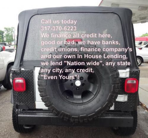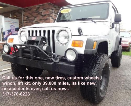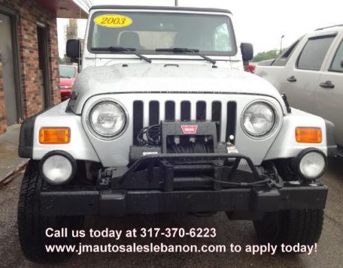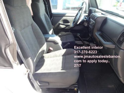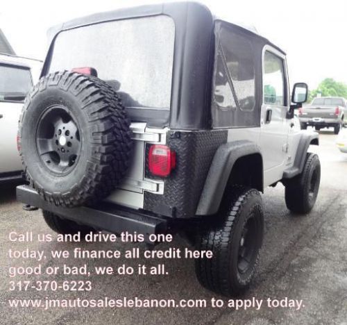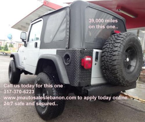 Only 39,876 miles on this Jeep Wrangler Sport 4WD and it has lots of equipment! Manuel transmission, custom alloy wheels, new tires and brakes, air conditioning, in line 6cyl motor, great sound stereo with sound bar, winch, compressor, and its has a lift kit as well, one nice Jeep here. The paint is perfect as well as the interior, very nice, it even smells new. NO Accidents ever per CarFax report that we run on every vehicle we sell, your assured of quality here. We inspect, serviced and provide you a zero deductible warranty good nationwide at no cost to you. You'll never pay for a covered repair and you take it where you want to go. We accept any and all trades, just drive them in to us. We accept cash, cashiers checks, money orders, bank drafts and wires, all major credit cards or finance with one of our many lenders that we offer to you at competitive rates and terms. We have over 35 major lenders such as banks, credit unions, finance company's and we even offer our own In House Lending program for those with no credit, slow credit, repossessions, collections, bankruptcy chapter 7 or 13, medical collections, tax liens, the self employed, you name it we do it, and we do any credit, from any town, from any state, we offer nationwide lending here, call us today and drive this one home tonight, our phone number is listed on the ad and our website is there too, apply 24/7 safe and secured. Visit our website at www.jmautosaleslebanon.com for more pictures or give us a call at 877-730-3227, ask for Jerry! Why Buy from us! Our dealership, has a smaller more personal, very honest, family way of doing business. We can offer you a better value for the dollar because of our low overhead, so you get more vehicle for less money at J&M Auto Sales Inc of Lebanon. All our vehicles go thru an inspection process and are repaired and certified ready before you even look at the vehicle. Our fee's are of course Indiana Sales Tax, BMV Fee's and our Doc Fee. We also offer to yo *IMPORTANT NOTICES* SEE VIDEOS OF OUR VEHILCES AT www.jmautosaleslebanon.com FREE 6 MONTH OR 6,000 Mile Warranty. Vehicles pass a 75 point inspection before offered for sale. All Vehicles are certified and come with a free warranty and free carfax history report. Prices do not include doc fee, registration, or state sales tax. We have financing, banks, credit unions, ect, for almost anyone!