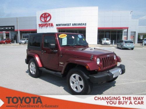 -NEW FRONT BRAKES, OIL CHANGED, NEW WIPER BLADES, MULTI-POINT INSPECTED, AND VEHICLE DETAILED- Satellite Radio, and 6 Cylinder Engine -Low Mileage- -NHTSA 5 Star Crash Test Rating!- This Red 2008 Jeep Wrangler Sahara is priced to sell fast! Toyota of Northwest Arkansas prides itself on value pricing its vehicles and exceeding all customer expectations! The next step? Give us a call to confirm availability and schedule a hassle free test drive! We are located at: 411 South Metro Parkway, Rogers, AR 72758. Arkansas's Largest selection of used and Certified Toyota vehicles. Come see for yourself how Toyota of Northwest Arkansas's honest and upfront approach will change the way you buy a New Toyota.
