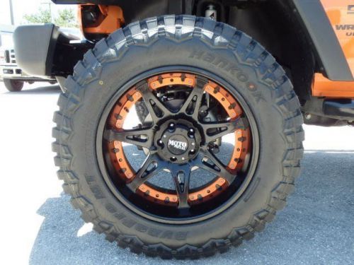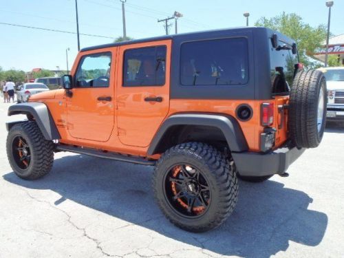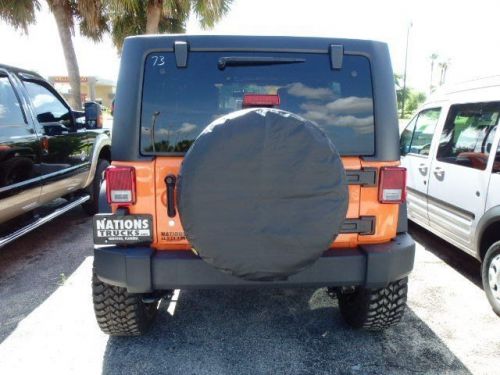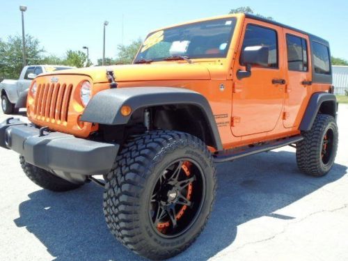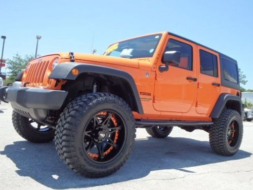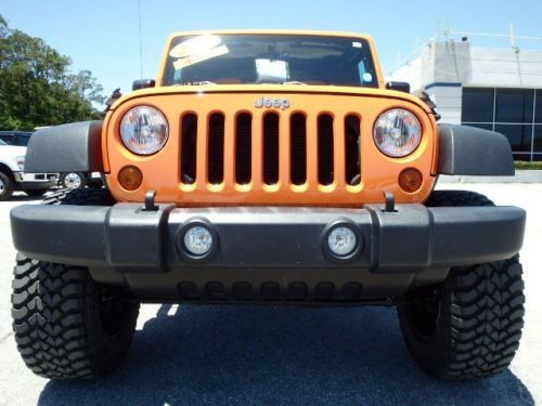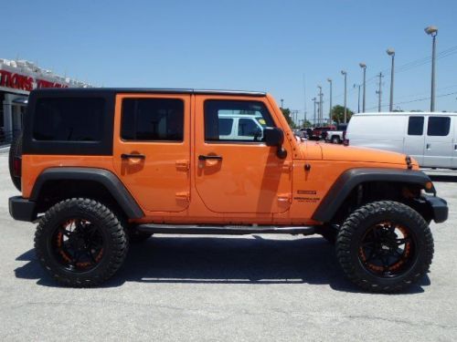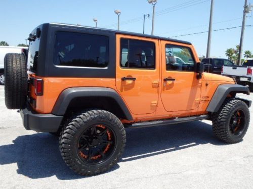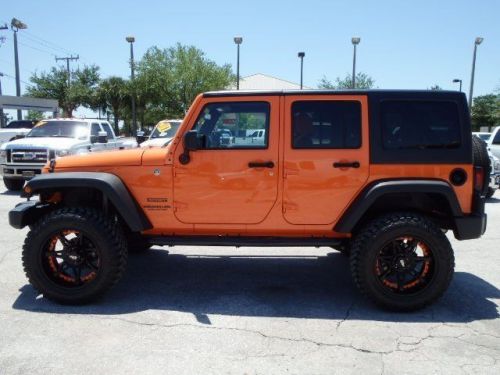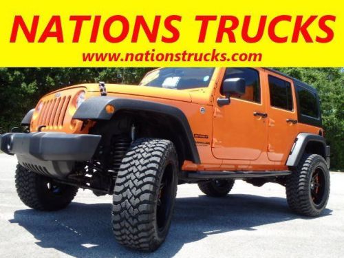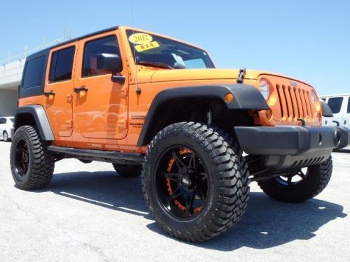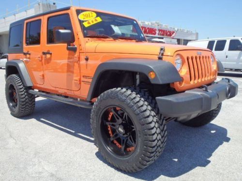 2012 Jeep Wrangler Unlimited Sport 4x4, FLAWLESS ONE-OWNER with only 28K miles, fully inspected, serviced and certified with balance of manufacturers warranty until 6/18/2015! This one a kind Orange Crush Wrangler rides high atop a new 4" Rough Country suspension lift, four brand new 35" Hankook tires and 20" Moto Metal wheels and she comes fully equipped with power windows, power doorlocks and mirrors, cruise control, tilt steering wheel, AM/FM stereo with CD/MP3 player, Wet Okole Hawaii seat covers and much much more! For a better truck at a better price visit Florida's new truck alternative Nations Trucks today and let us help you find the perfect truck for both you and your budget! Repair Description: 135 Point Inspection, 25 Mile Road Test, Lube Oil and Filter, Battery Test: Good, Installed New Lift Kit, Mounted and Balanced Four New Tires & Wheels, Full Detail, Total Invested = $3,555.00...Labor time quoted by All Data Universal Shop Key*see dealer for details All certified Nations Trucks have been fully inspected and serviced and come backed by our ONE YEAR BUMPER TO BUMPER WARRANTY! We look forward to earning your business, please call 866-535-5519 to schedule your test drive or visit us anytime at www.NATIONSTRUCKS.com