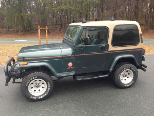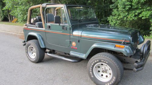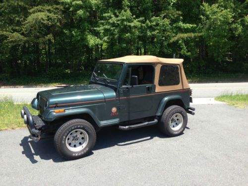 It's not absolutely perfect, it's a 20-yr old Jeep, so there are a few scratches, but no dents and the original paint still shines. I get lots of comments, honks and of course the Jeep Wave. Clean CarFax! A very nice, mostly-stock, all-season Jeep. With the hard and soft top, plus two sets of rims, you can mix and match and run it all year long. Runs great, shifts smoothly. I've never had it off-road, (I doubt it has ever been), but I do put it in 4x4 every few months just to keep things lubricated. I hate to sell it, but the house needs some updates. It is for sale locally as well, so I reserve the right to end the auction early. Other highlights: - Hard and soft tops - Full doors - New radiator, thermostat and water pump - New shocks and steering stabilizer - New tube bumpers and nerf bars, all are rhino-lined. Also had the frame re-coated. - Two sets of rims - the bullet hole rims that are currently on it and the original factory rims. You can have a summer set and a winter set. - 2-inch body lift. - 31" Cooper Discoverer HT tires currently on it, good rubber left. The factory rims have 31" BFG A/Ts (although not much life left in those. Then again, those tires go basically forever). - Upgraded audio (Polk and Infinity speakers in the dash and sound bar, 6.5" Bazooka tube in the "trunk"), Premier CD player (the display does not work, but it sounds great. Also has an iPod/iPad connection). - Interior is in great shape. Original seats, no rips (one slight snag in the rear seat, which is shown in pictures). Original carpet. - Replaced rear axle bearings a few months ago. - Factory A/C (could use a recharge) - Garage kept, adult driven, basically babied. It's had an easy life, and it shows. - When it first developed a radiator leak, I put Bar's Leak in it until I had time to mess with the radiator. It was an OK stopgap... Until the water pump gave out a week or so later. So there's a bit of an orange coating on the engine bay. I've been gradually cleaning it, but there's some places I can't reach. I'll be happy to answer any questions or send more pictures. I have not shipped vehicles before, but I know some folks who have and will be happy to provide references if you don't know anyone. Or, you're welcome to visit Winston-Salem and pick-it up in person. $750 deposit due when the auction closes. Thanks for looking! |